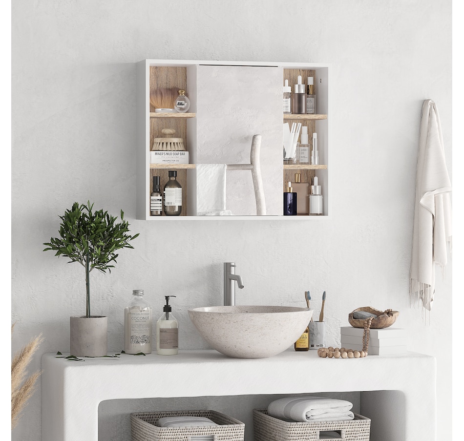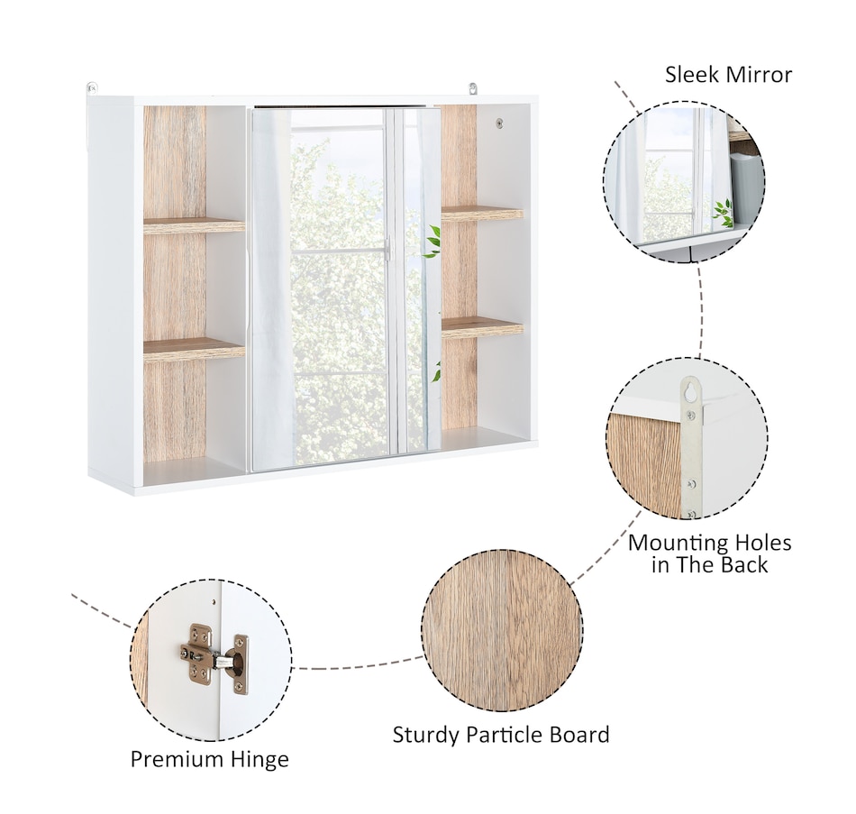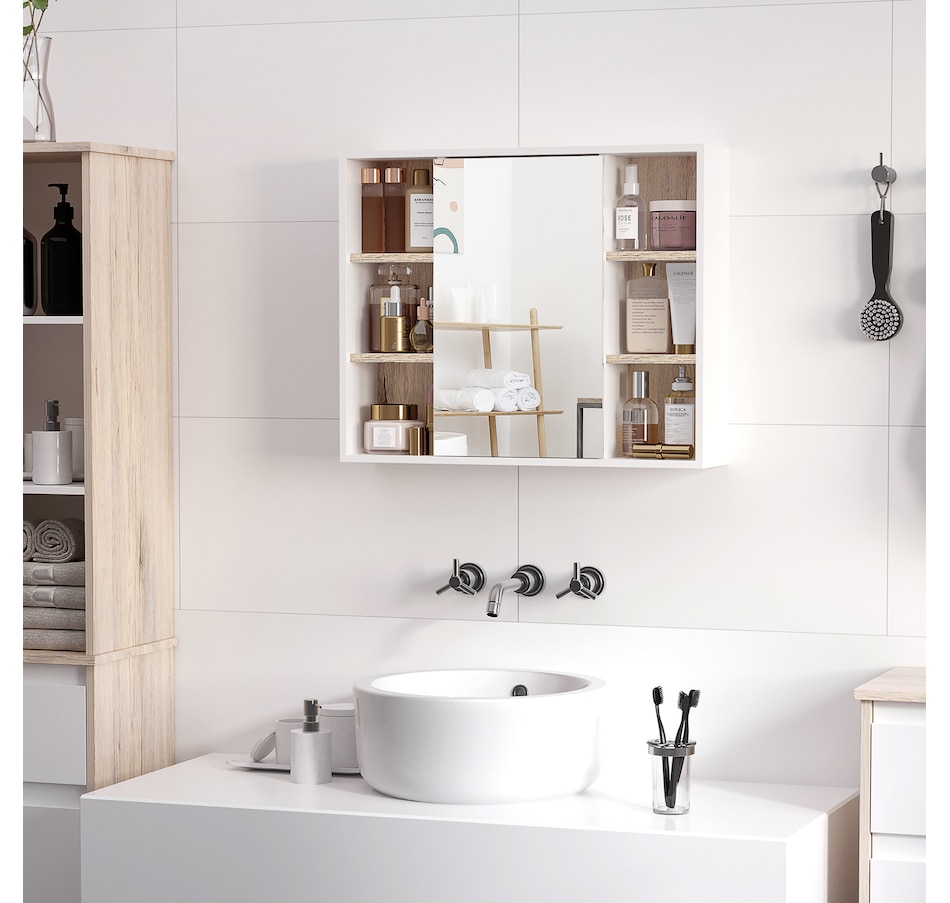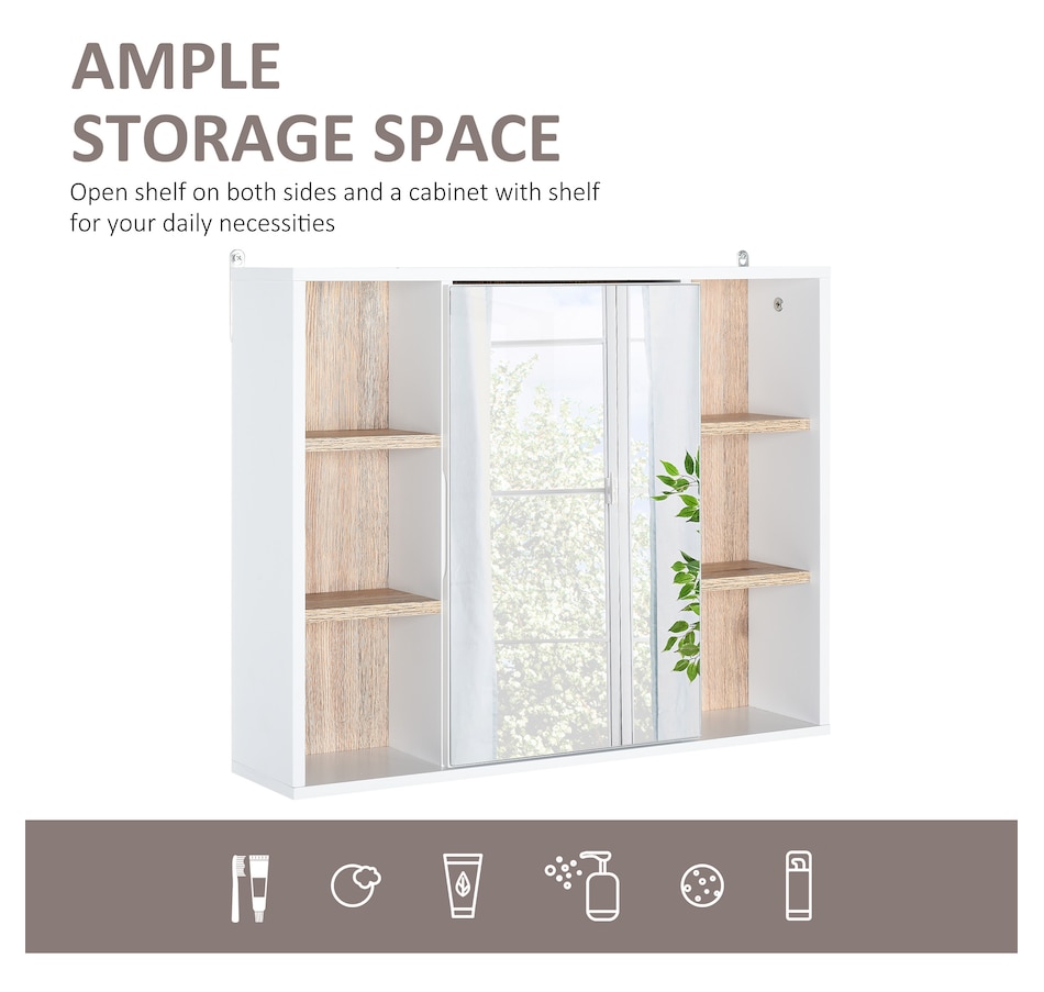 This bathroom medicine cabinet from HOMCOM is an attractive artwork that is specially designed for all your cosmetics or articles of everyday use keeping well organized. Besides, there is a cupboard with two adjustable shelves, so you can adjust the height according to the size of the items for your more convenient storage needs. The wall-mounted feature makes the bathroom storage cabinet space-saving, perfect for smaller rooms, such as bathroom, powder room.Features:
