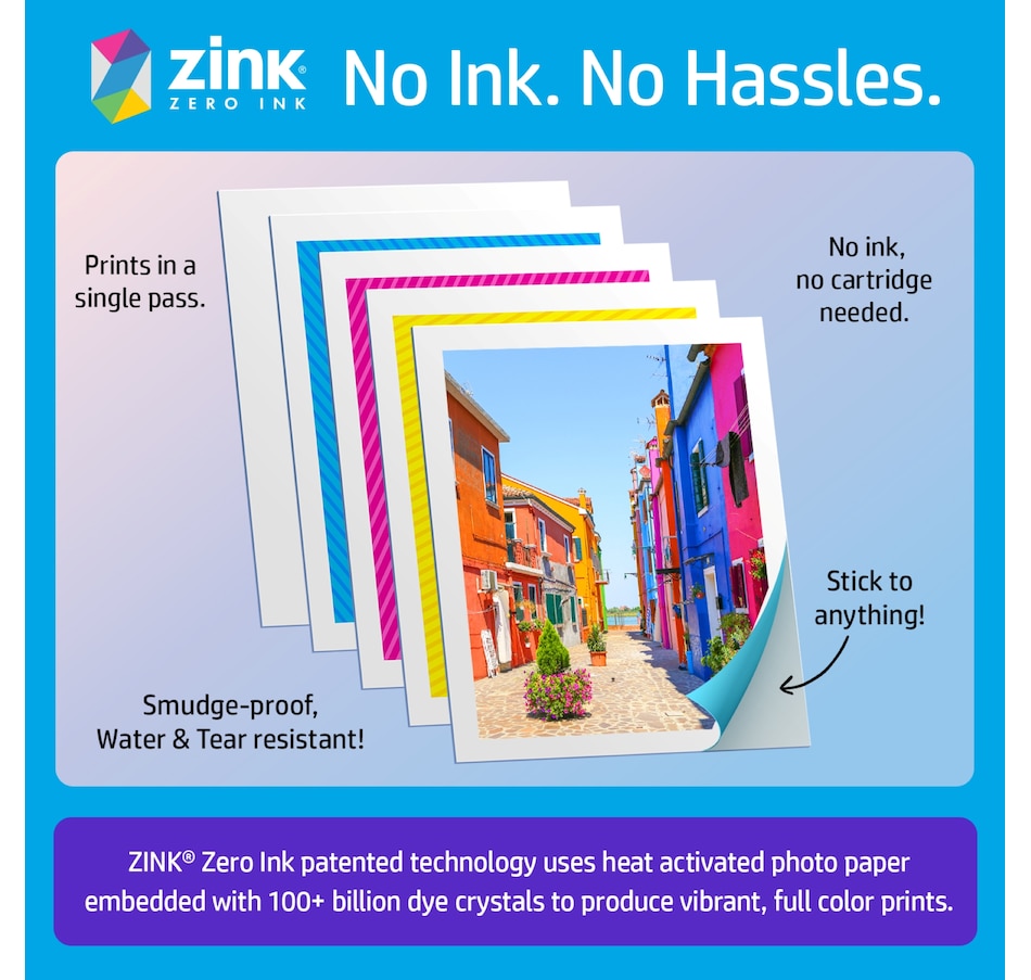 - Zink Technology Photo Paper eliminates the need for costly film and printer cartridges