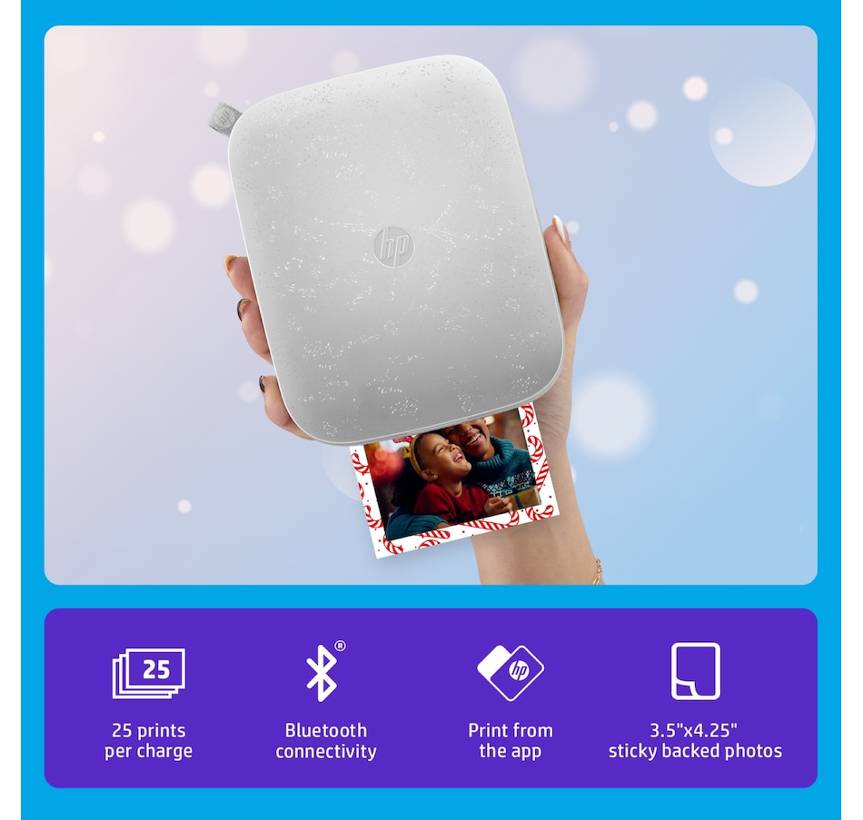 Download the HP Sprocket app on your smartphone and customize your photos before you take them to the mini photo printer. Create fun, vibrant, and colorful prints using borders, stickers, and more on the mini printer photo-editing app. With the features of this portable photo printer, you can share your eye-popping images on social media or spread your 3.5” x 4.25” prints to friends and family. With Zink paper in your pocket printer, your photos produce vivid color without the need for ink. Make your photos your own then print them out on water-resistant, tear-resistant, and sticky-backed Zink paper. The portable design of this phone photo printer allows you to capture and print out fantastic moments anywhere you go. Snap beautiful photos on vacation, during holidays, and at parties, then get gorgeous, clear prints of bright smiling faces instantly with the HP Sprocket 3x4 Instant Printer.