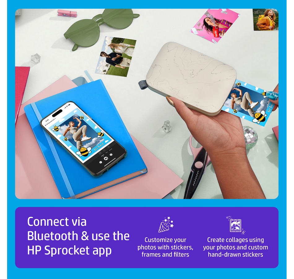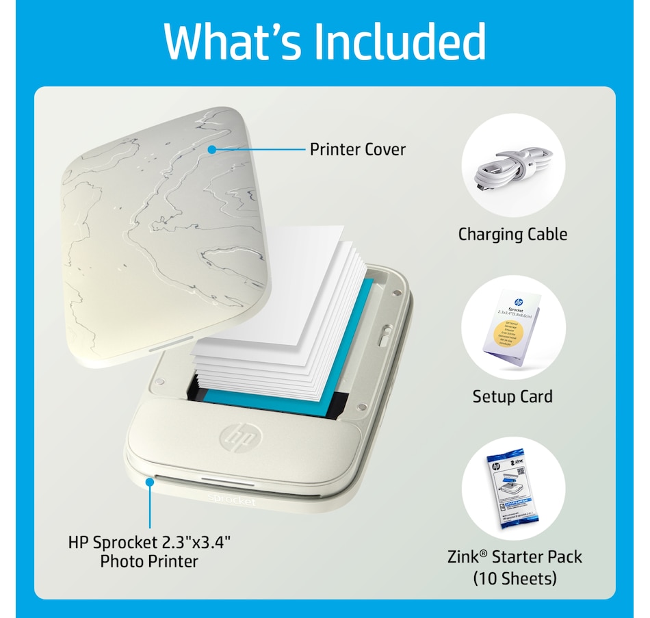 Produce glossy 2.3x3.4" sticky-based photos 30% larger than the original Sprocket instant printer, and transform them into curated memories. Download the free HP Sprocket app to access exclusive designer features for your pictures, customize your photos with doodles before printing, and unlock content in augmented reality. Search the app by hashtag to seamlessly filter and print social media photos from your smartphone. And with the compact, sleek design, you can take this mini printer anywhere with ease. This mini photo printer quickly allows you to relive moments through gorgeous prints. Invite your friends and family to print their photos using the seamless Bluetooth connectivity featured on this convenient pocket printer. Customize and add personality to your prints using the HP sprocket photo printer app. Use the app to print your pictures posted on social media. With this portable photo printer, you will definitely spend your time creating a lot of prints. And don’t worry about buying ink for your mini picture printer. This device is compatible with Zink paper making ink and toner a thing of the past. This reliable portable picture printer will bring new life to you and your photos.