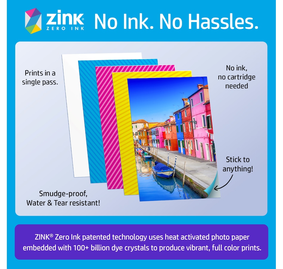 - Zink Technology Photo Paper eliminates the need for costly film and printer cartridges
