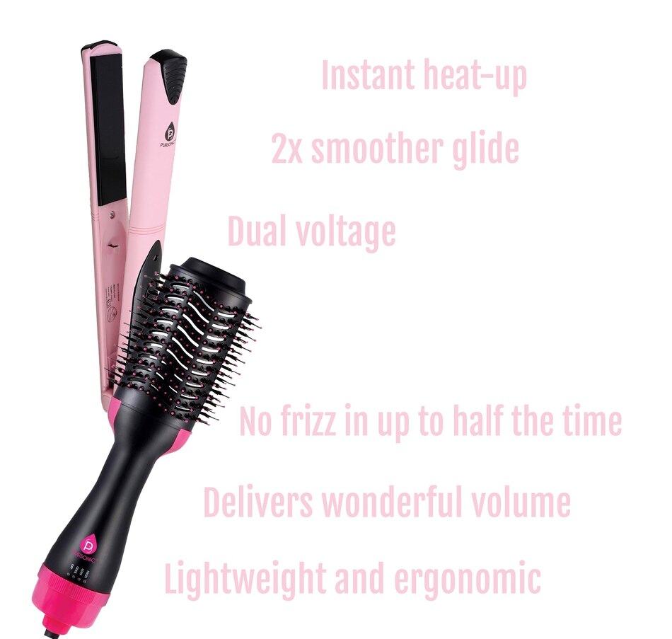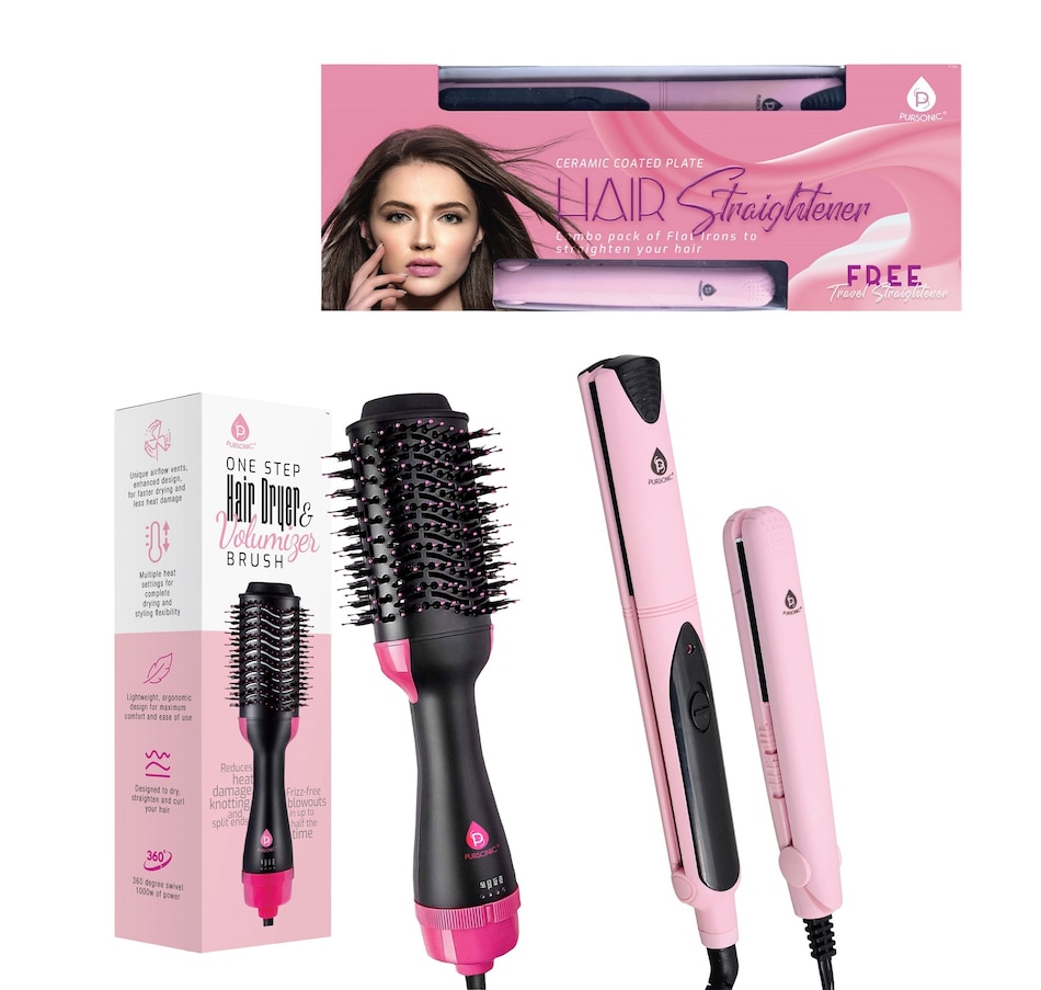 Achieve salon-worthy hair styling with the Pursonic Hair Styling Power Bundle, featuring the One Step Hair Dryer & Volumizer Brush and the Professional Salon Quality Flat Iron Hair Straightener with a Free Travel Straightener.
