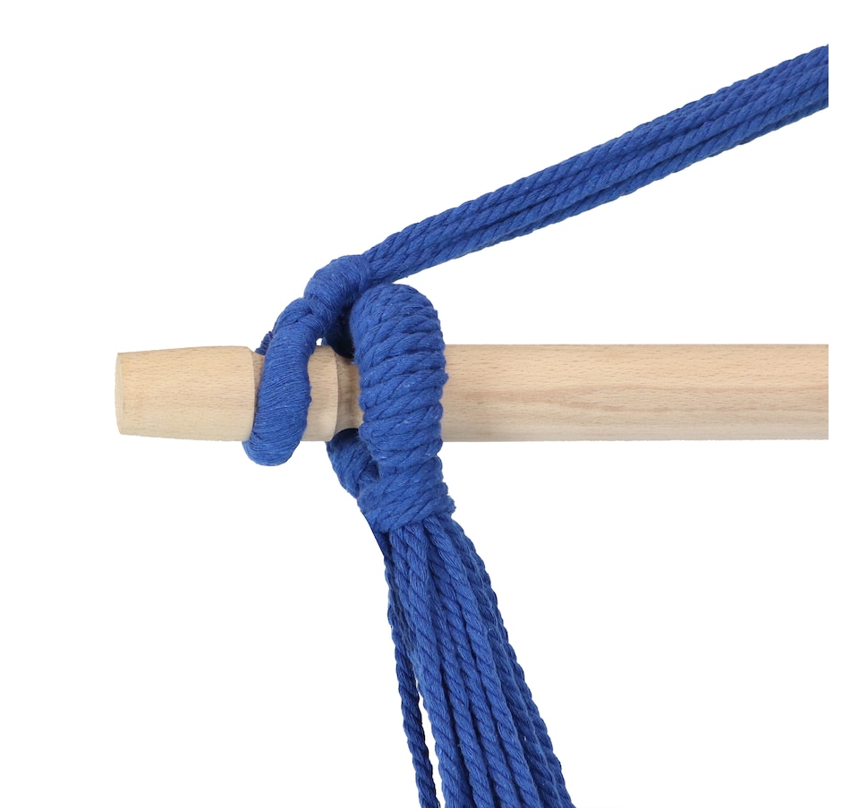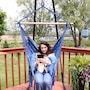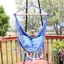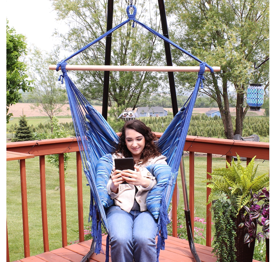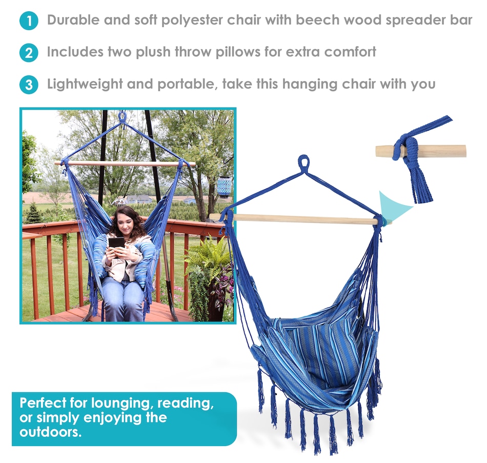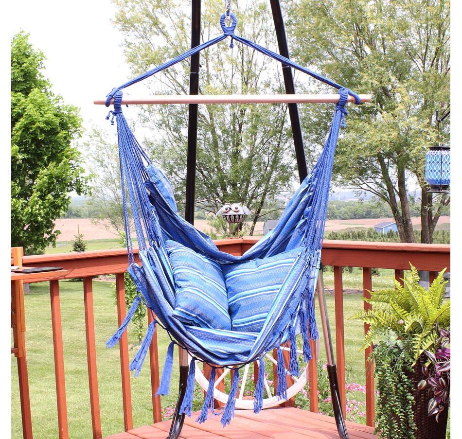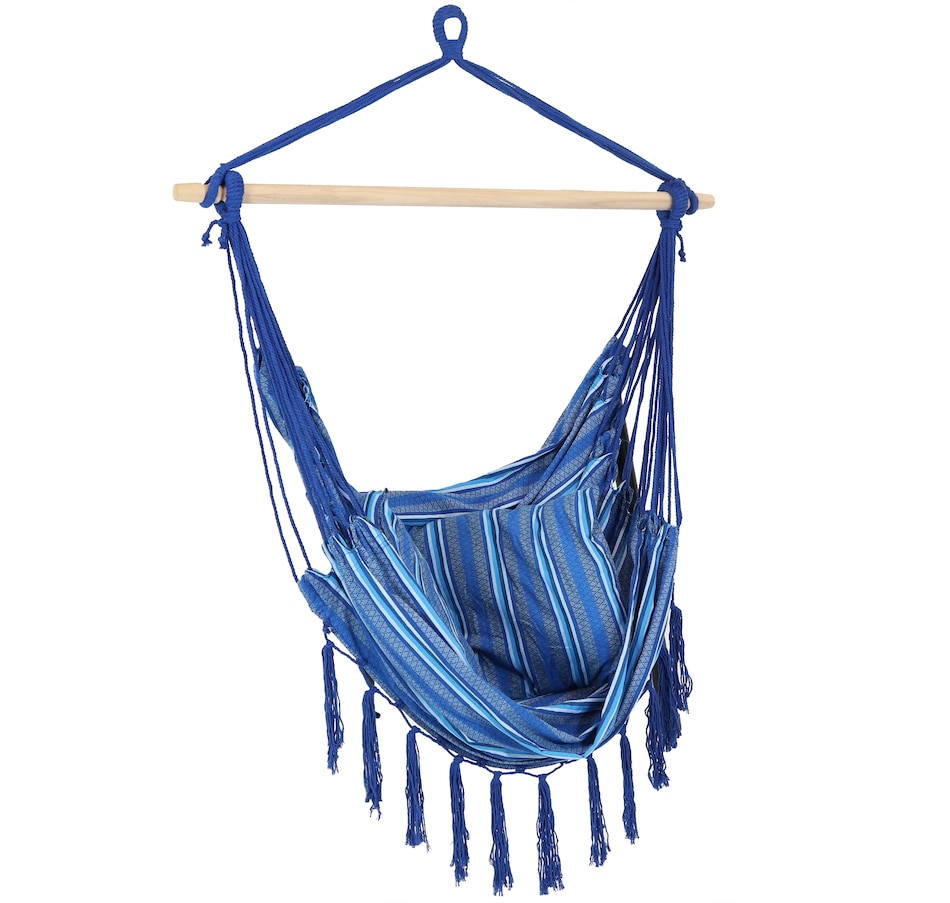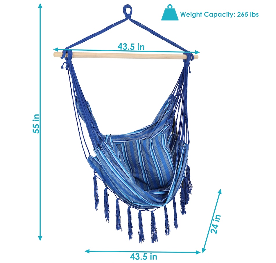 Add a comfortable place to relax on the patio, porch, deck, or backyard with this hammock chair swing. This hanging hammock chair features a cushioned seat and a soft back for extra comfort while enjoying an evening on the patio watching the sunset. The beautiful blue hues of the soft fabric are sure to complement any outdoor decor style. The spreader bar is made from strong beech wood, and the chair cover is made from durable polyester with a polyurethane foam fill and can support up to 265 lbs. Hang this chair from a hammock chair stand (stand not included), a supportive beam on the porch, or a tree branch to enjoy some quiet reading time or conversation with friends and family. Please note, no hanging hardware is included with this hammock chair. Whether enjoying a cup of coffee in the morning or unwinding in the evening, this comfortably hammock chair is sure to be a new favorite relaxation place.