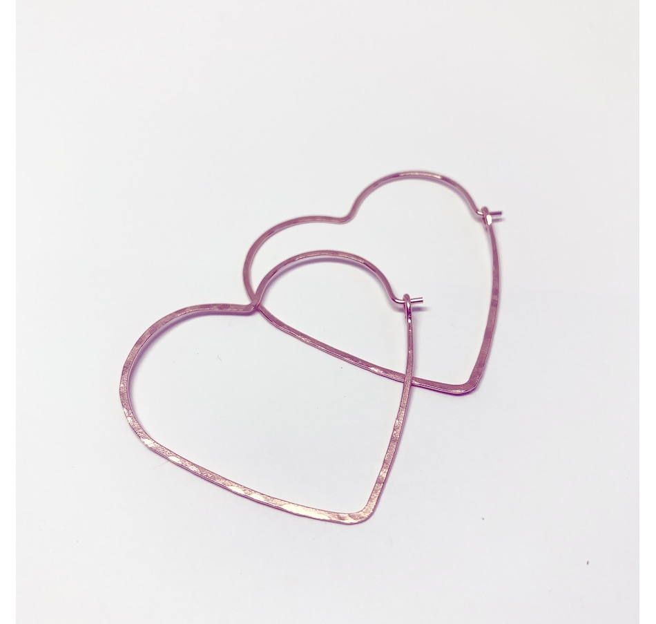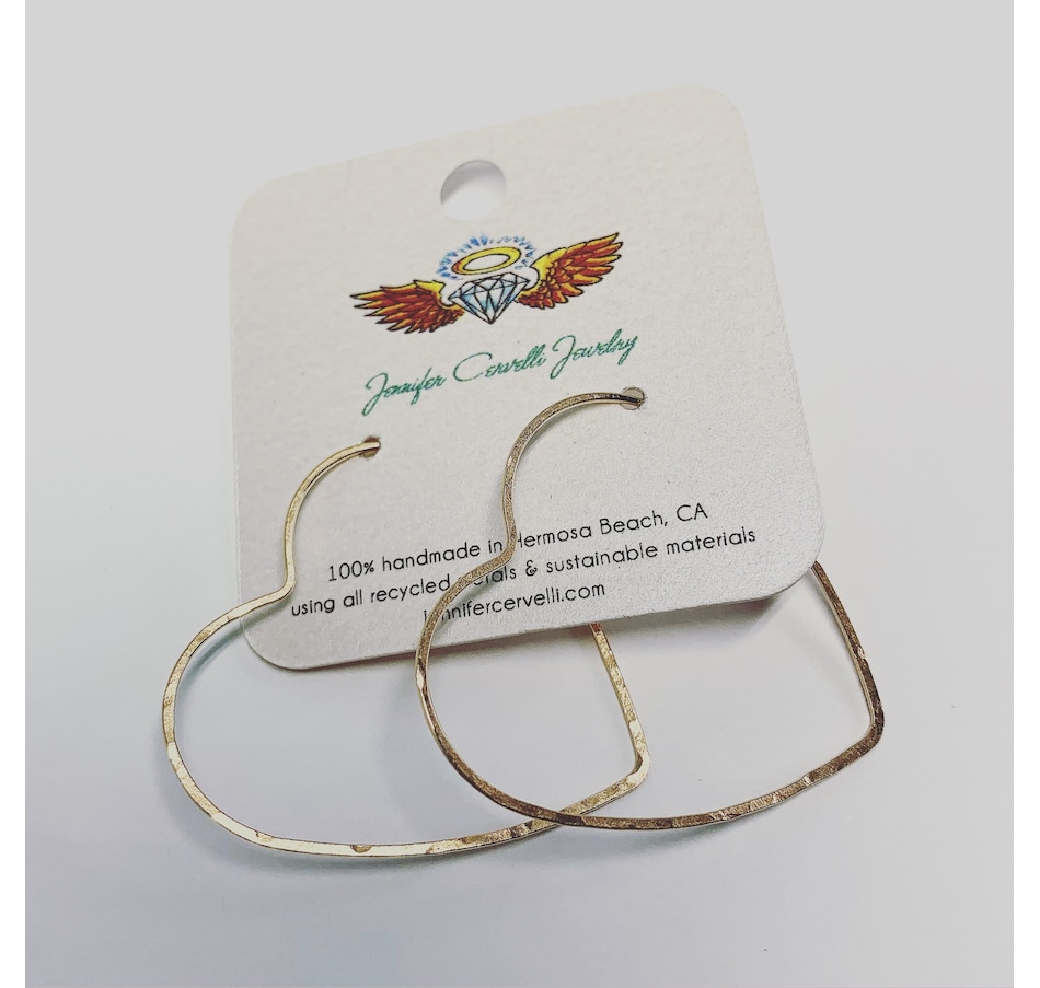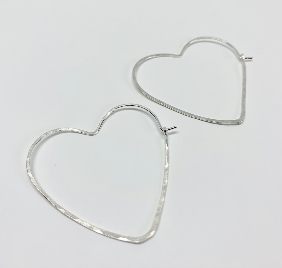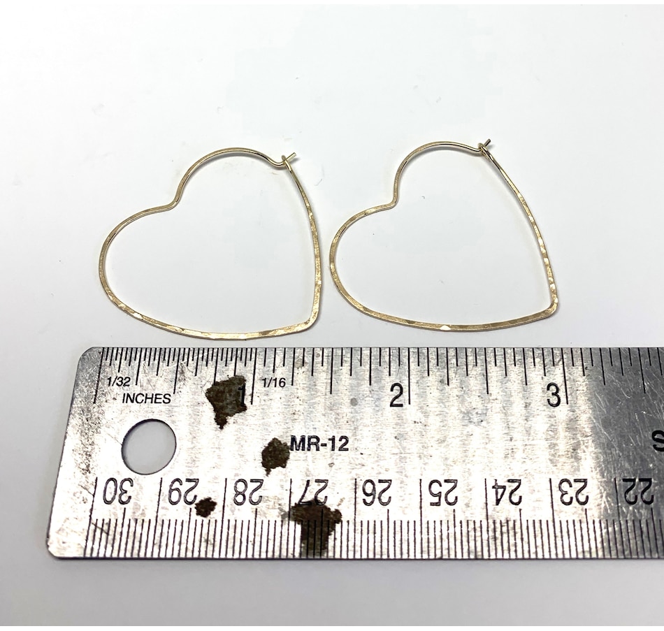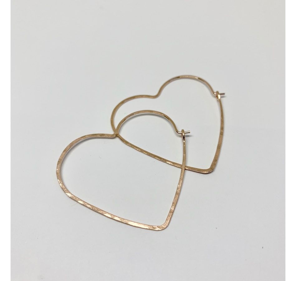20 gauge wire is hand formed and forged into classic everyday heart shaped hoops. Lightweight and elegant, the hammered texture adds shine and aesthetic. These hoops are 1.5" across. These gorgeous, textured hoops are a part of The Spirit Collection: Adornment for those extra special moments in life, designed to celebrate life, love, and joy. These lovely hoops are completely hand formed. These are available in silver, yellow gold fill, or rose gold fill.100% handmade in Hermosa Beach, California USA using recycled metals and sustainable materials. These are made to order, so please allow up to 1 week production before shipping. Thank you!