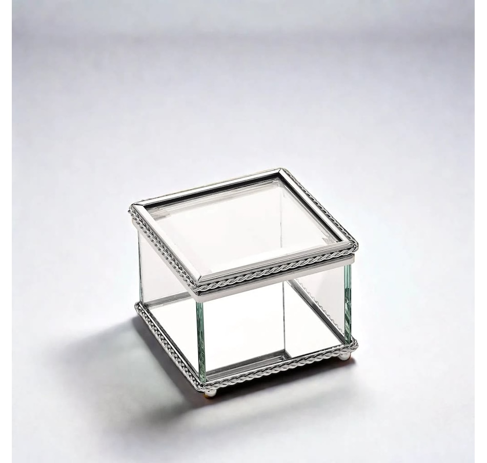 This beautiful 3.25" x 3.25" x 2.50" H square box is glass and has a hinged cover. The top and bottom edges are trimmed with a non tarnish braided border. The inside bottom is a mirror and the bottom of the box has four ball feet. White gift box.