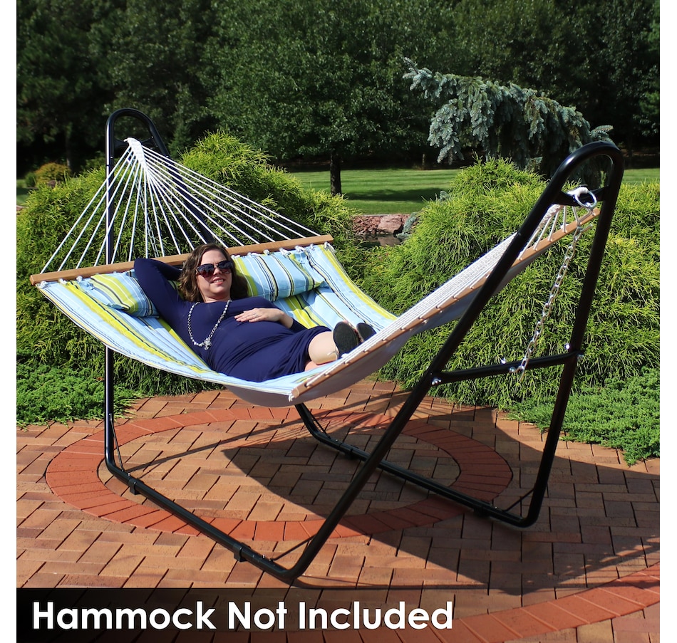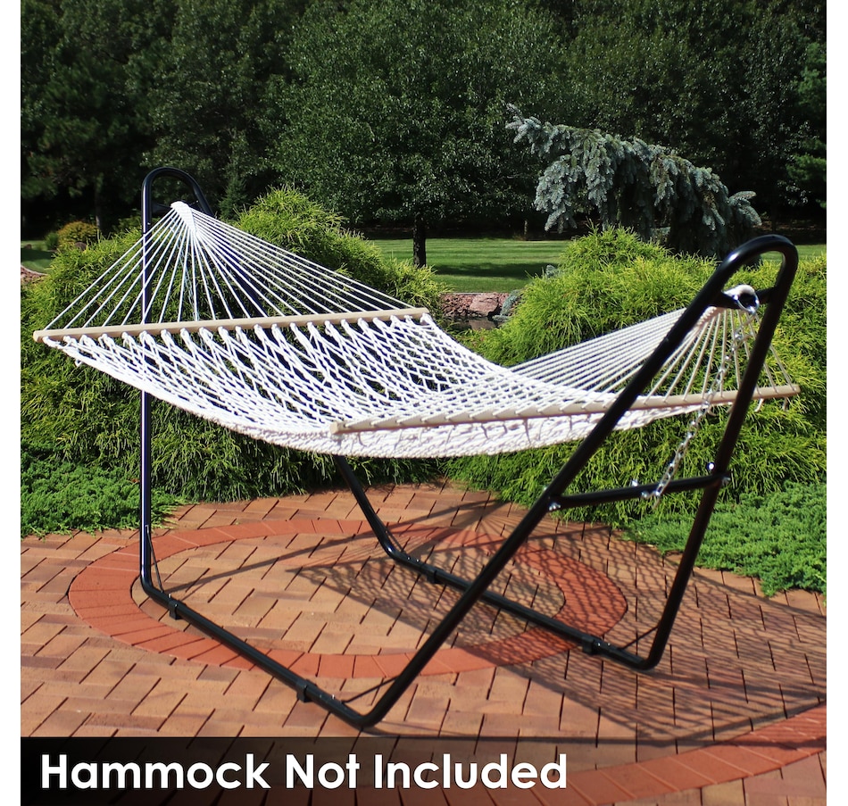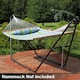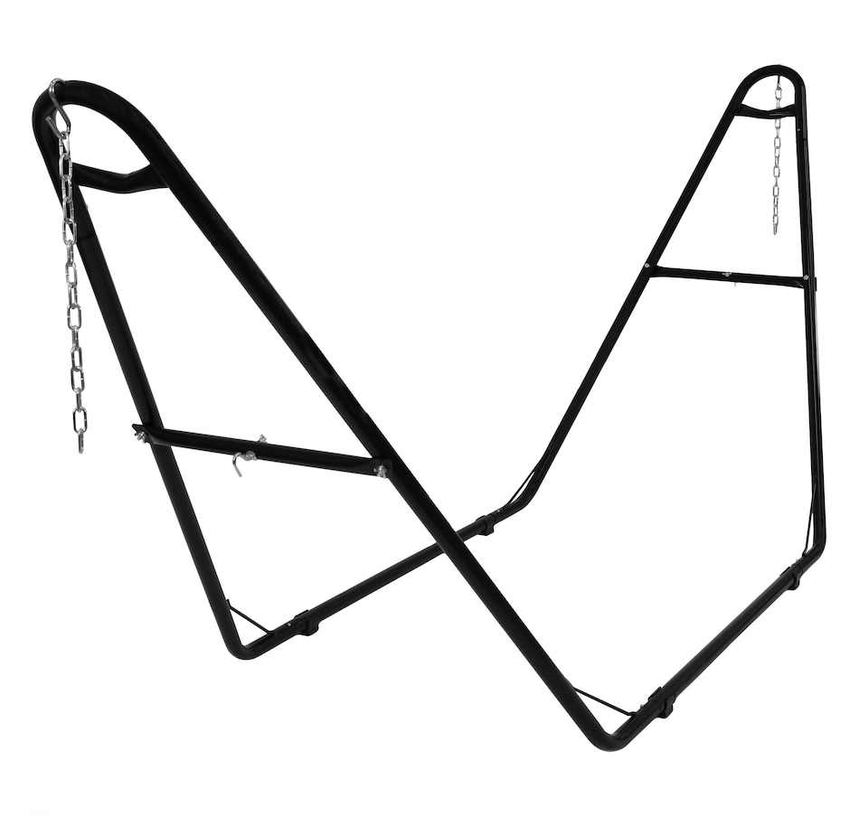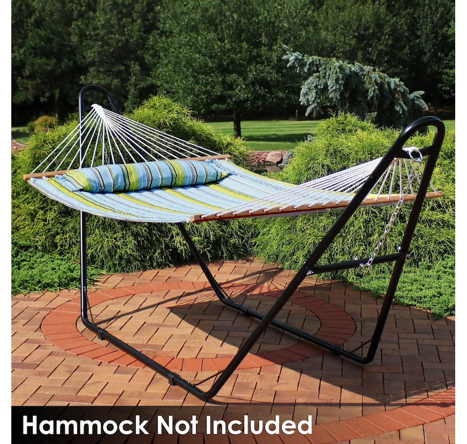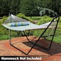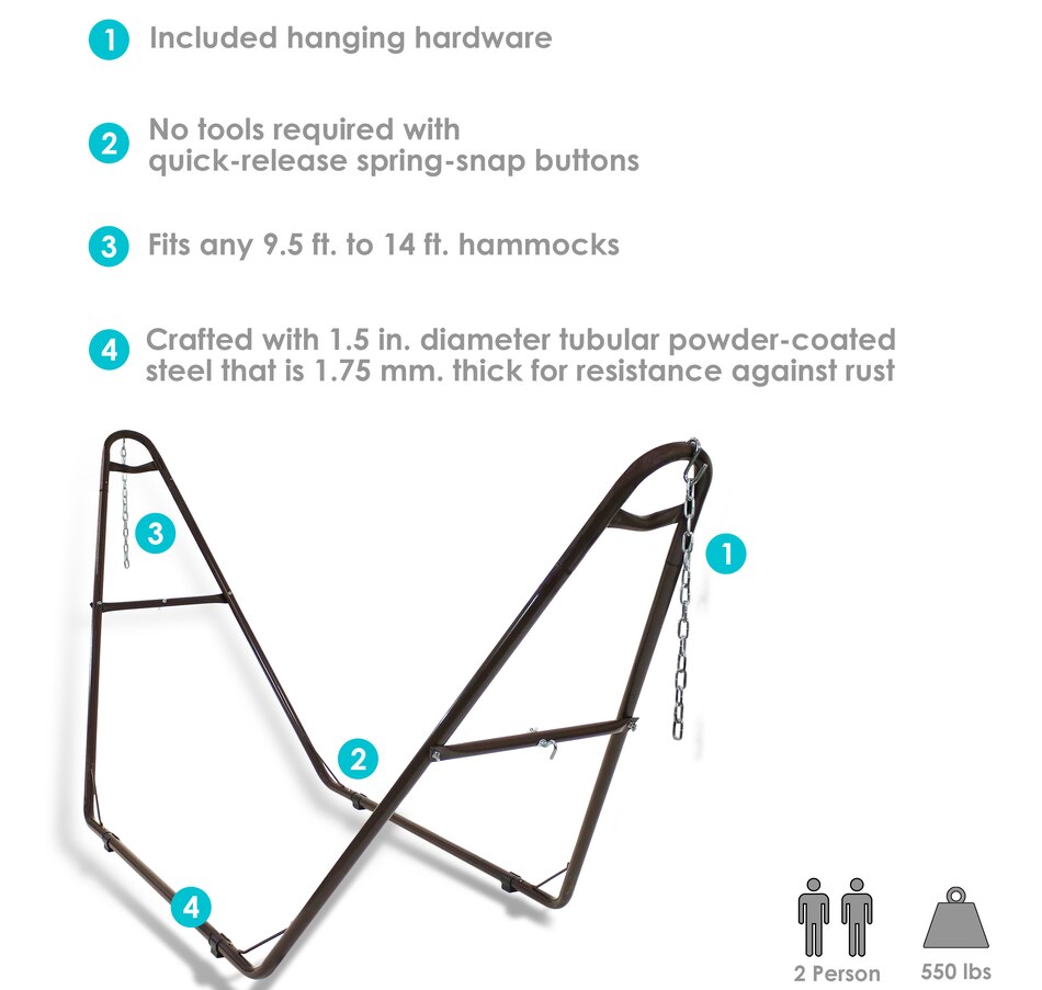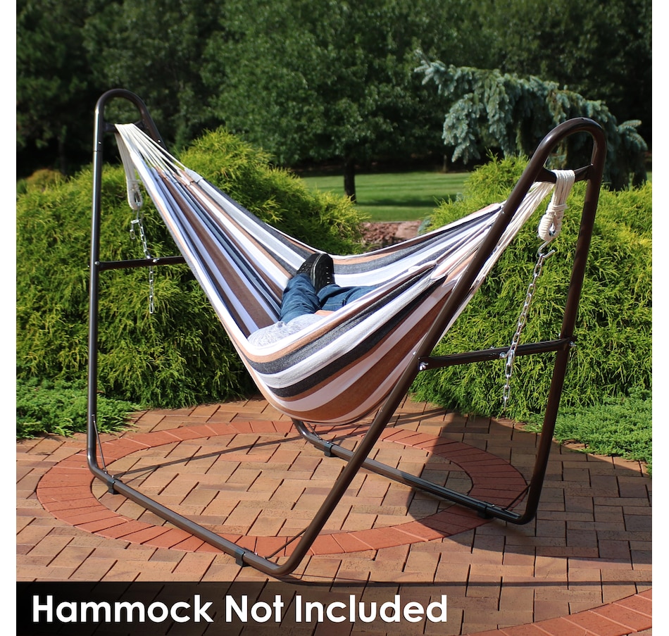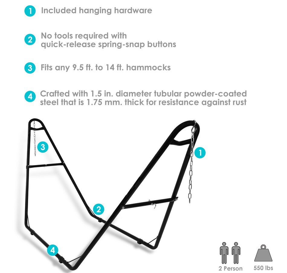 Relax and enjoy the outdoors on the patio or deck, in the garden or yard, or even inside the living room, bedroom, or sunroom with this universal hammock stand. Featuring a sturdy A-frame design and ultra-durable, 1.5-inch powder-coated steel tube frame for rust resistance, this patio hammock stand is strong, reliable, and weather resistant. This one hammock stand can suit all hammock needs! Whether it's a Mayan hammock, Brazilian hammock, camping hammock, or a spreader bar hammock, this stand will do the trick. The stand features adjustable chains and S-hooks so it can be adjusted to fit hammocks ranging from 9.5 feet to 14 feet long. Invite a friend or loved one to share in the relaxation as the double hammock stand boasts a generous 550-pound weight capacity, providing a secure and comfortable space for one to two people to unwind.