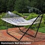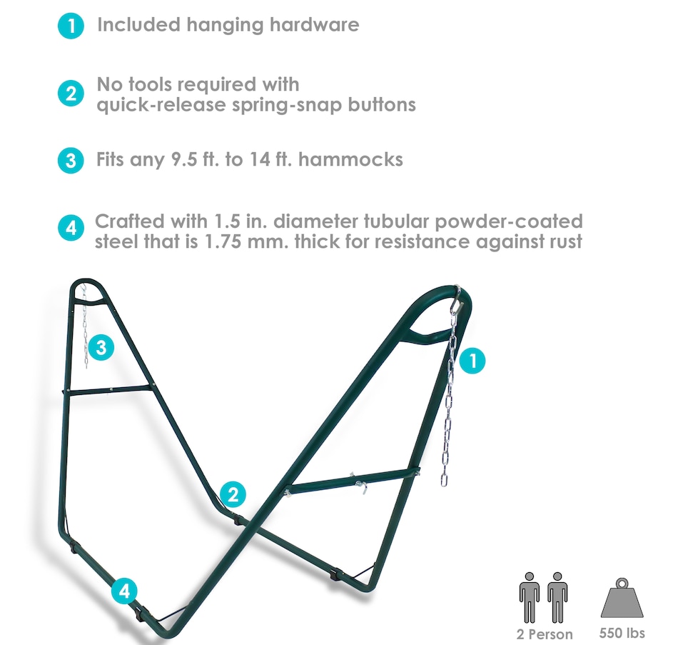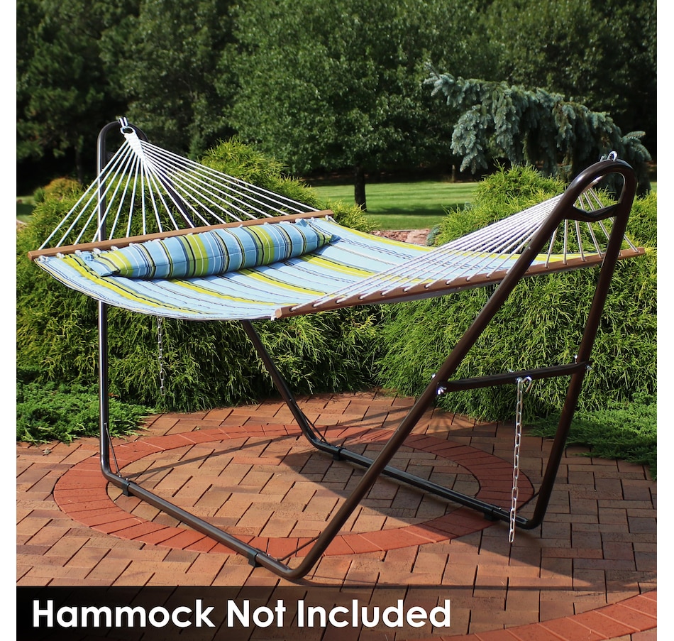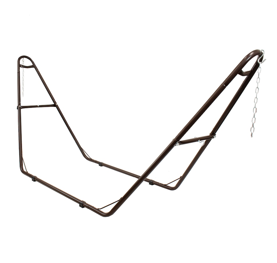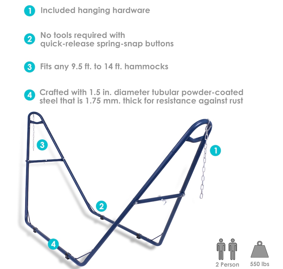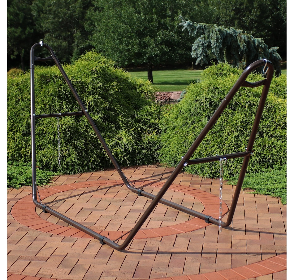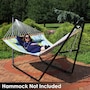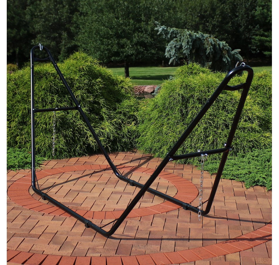 Relax and enjoy the outdoors on the patio or deck, in the garden or yard, or even inside the living room, bedroom, or sunroom with this universal hammock stand. Featuring a sturdy A-frame design and ultra-durable, 1.5-inch powder-coated steel tube frame for rust resistance, this patio hammock stand is strong, reliable, and weather resistant. This one hammock stand can suit all hammock needs! Whether it's a Mayan hammock, Brazilian hammock, camping hammock, or a spreader bar hammock, this stand will do the trick. The stand features adjustable chains and S-hooks so it can be adjusted to fit hammocks ranging from 9.5 feet to 14 feet long. Invite a friend or loved one to share in the relaxation as the double hammock stand boasts a generous 550-pound weight capacity, providing a secure and comfortable space for one to two people to unwind.