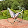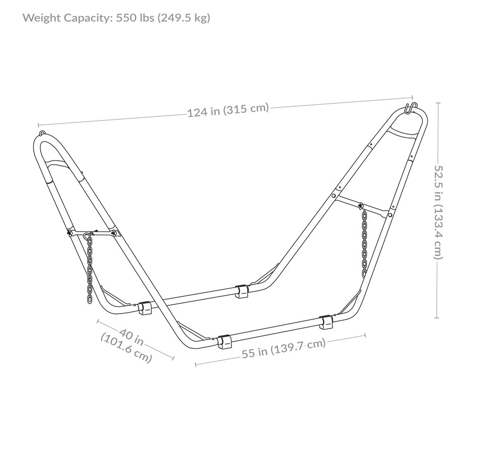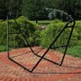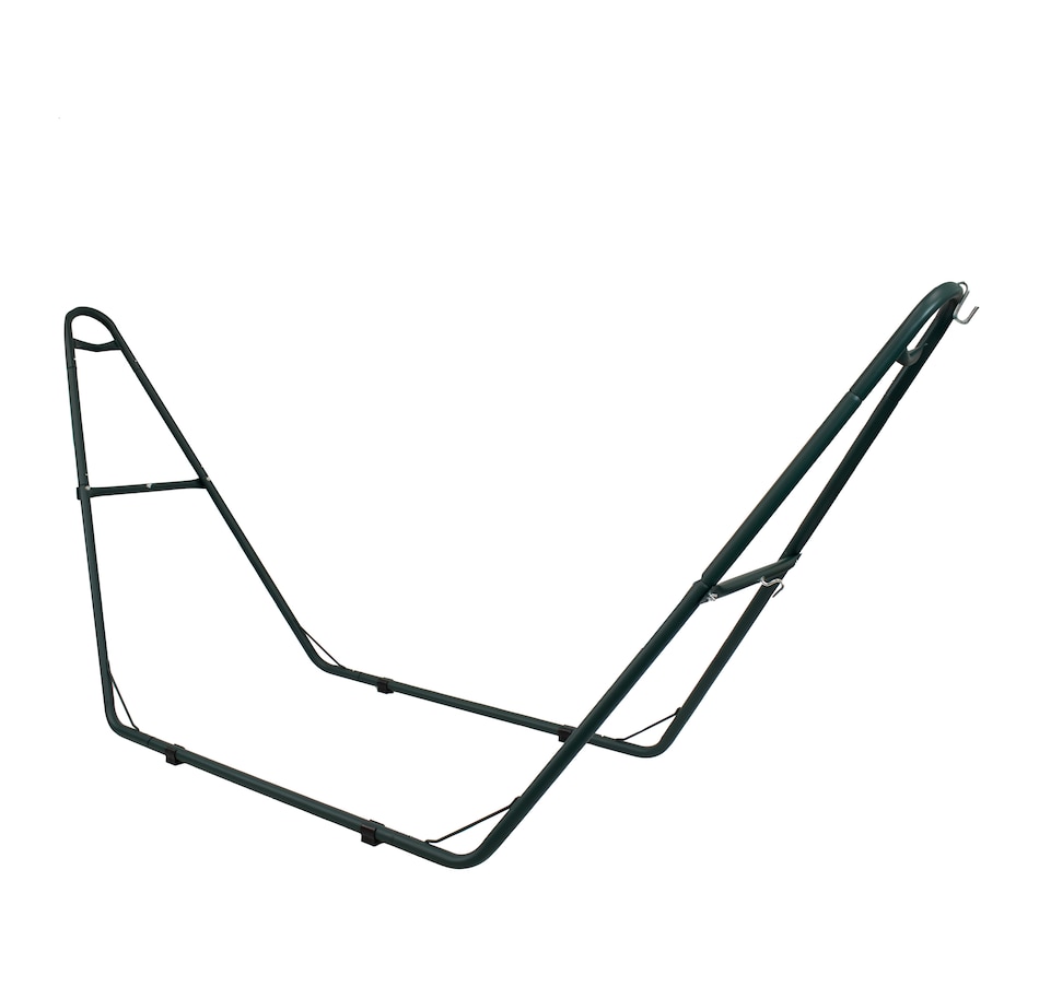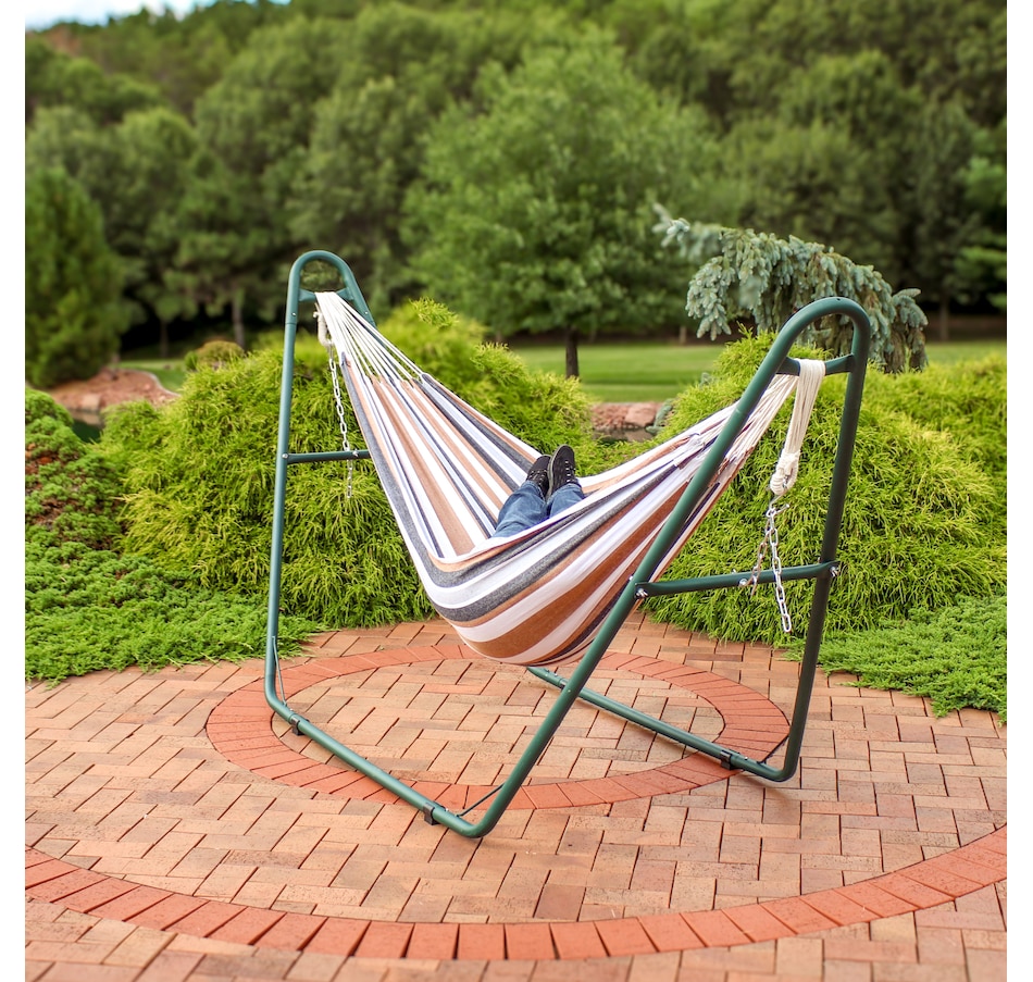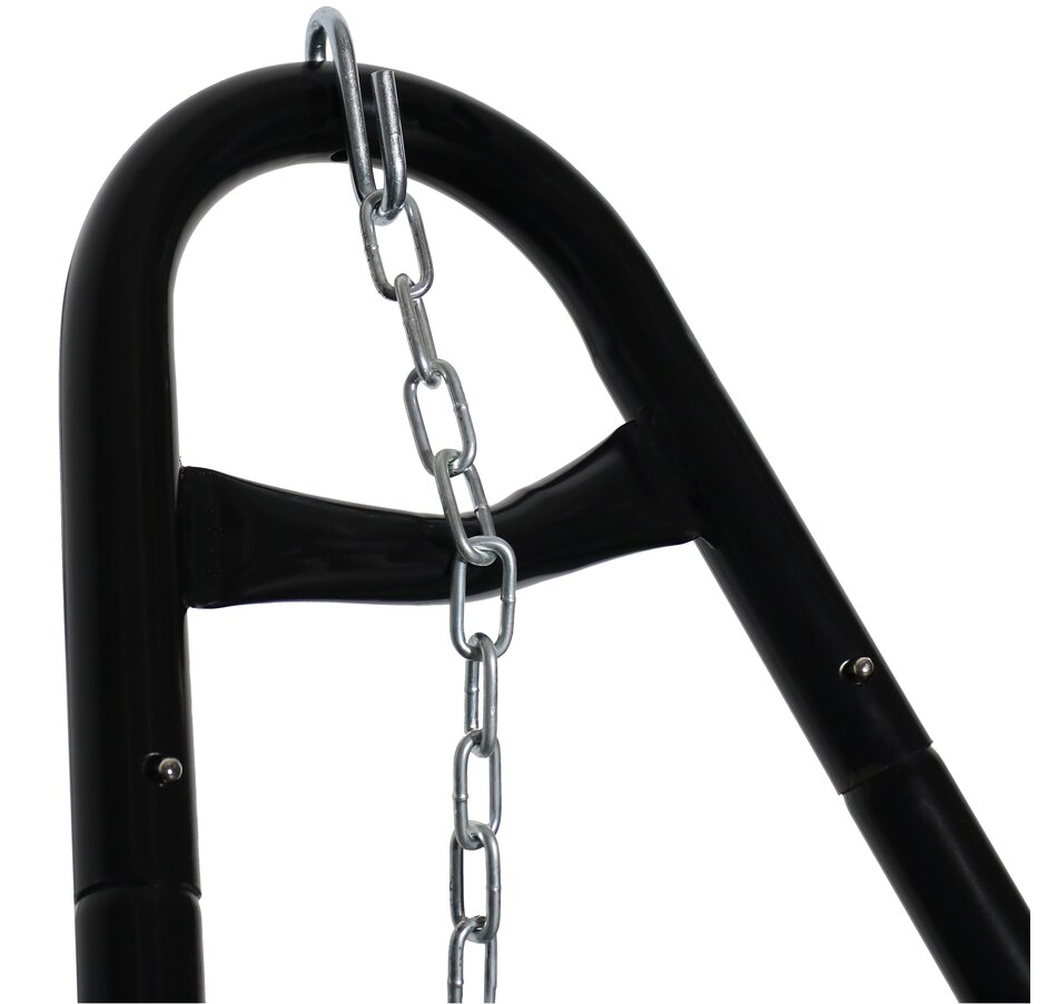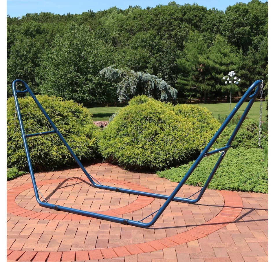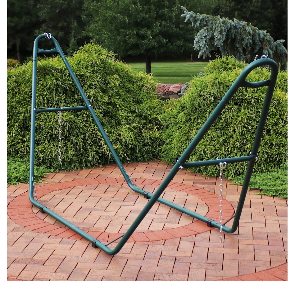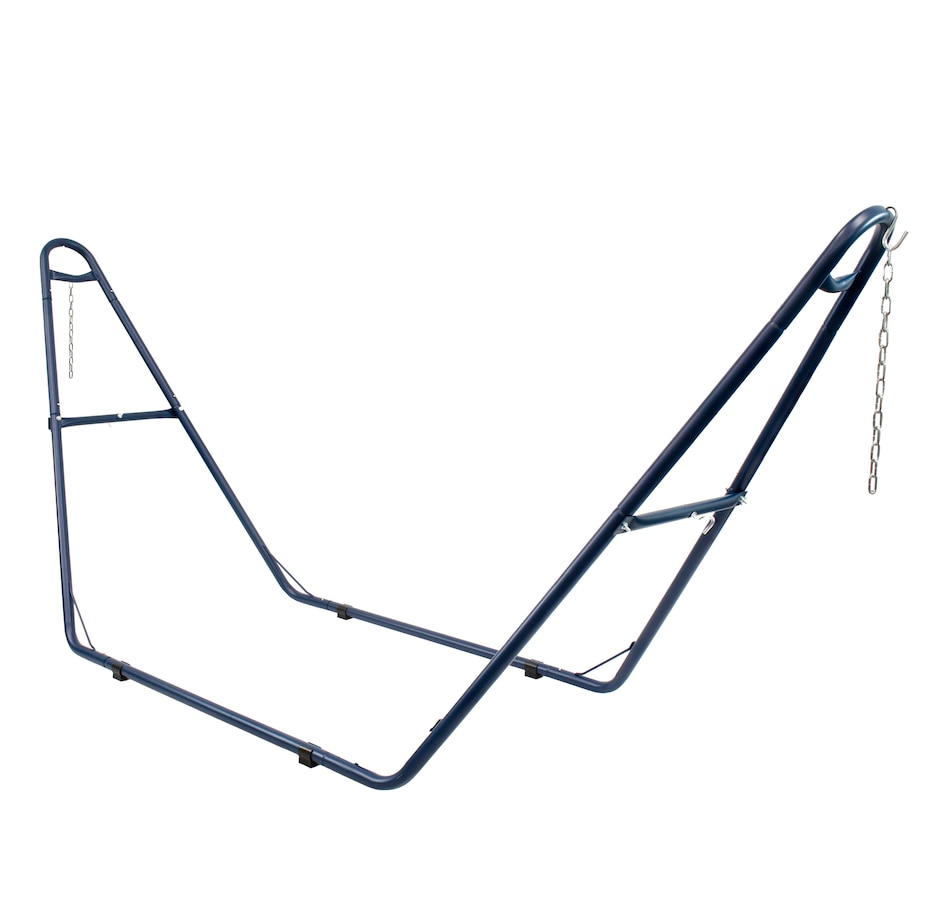 Relax and enjoy the outdoors on the patio or deck, in the garden or yard, or even inside the living room, bedroom, or sunroom with this universal hammock stand. Featuring a sturdy A-frame design and ultra-durable, 1.5-inch powder-coated steel tube frame for rust resistance, this patio hammock stand is strong, reliable, and weather resistant. This one hammock stand can suit all hammock needs! Whether it's a Mayan hammock, Brazilian hammock, camping hammock, or a spreader bar hammock, this stand will do the trick. The stand features adjustable chains and S-hooks so it can be adjusted to fit hammocks ranging from 9.5 feet to 14 feet long. Invite a friend or loved one to share in the relaxation as the double hammock stand boasts a generous 550-pound weight capacity, providing a secure and comfortable space for one to two people to unwind.