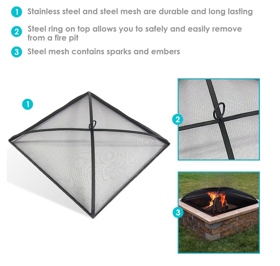 Make the fire pit safer and more stylish with this metal mesh replacement spark screen in a square design. A spark screen will help keep hot embers from sparking or popping out of the fire and landing on the ground or on loved ones. To use simply set it over the fire pit using the handle on the top of the screen. This screen comes available is many sizes to ensure a secure fit for the fire pit. The durable, steel construction ensures long-lasting use for years to come. This screen is also finished with a coat of heat-resistant paint to ensure longevity year after year. The fire pit spark screen is sure to keep the sparks, embers, ashes, and other fly-aways from the fire away from friends and family. Use the handle on top to easily place and remove the screen from the fire pit and to easily maneuver and add logs as needed.