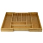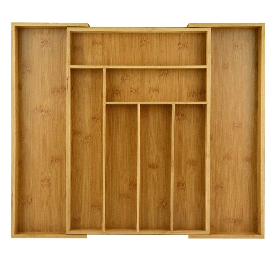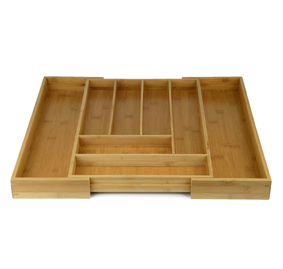This tray is made from natural organic bamboo which is more durable and attractive with its natural wood pattern. It's also easier to clean and maintain. While having 6 fixed slots in the middle and 2 expandable ones on both sides, it is ideal not only for holding kitchen utensils but also good for storing office supplies or cosmetics. This tray is custom designed and built to fit most standard drawers. It measures 17" in length, 12" in width and expandable to 22 in width, 2" in height..Six to eight compartments provide generous storage capacity. Measures 17 in. x 12 in. x 1.5 in, extend to 17 x 19 x 1.5 in..Kitchen storage for cutlery, silverware and flatware, with big spaces for utensils and gadgets too.Sturdy, well-built drawer organizer is beautifully made from eco-friendly, sustainable bamboo.
