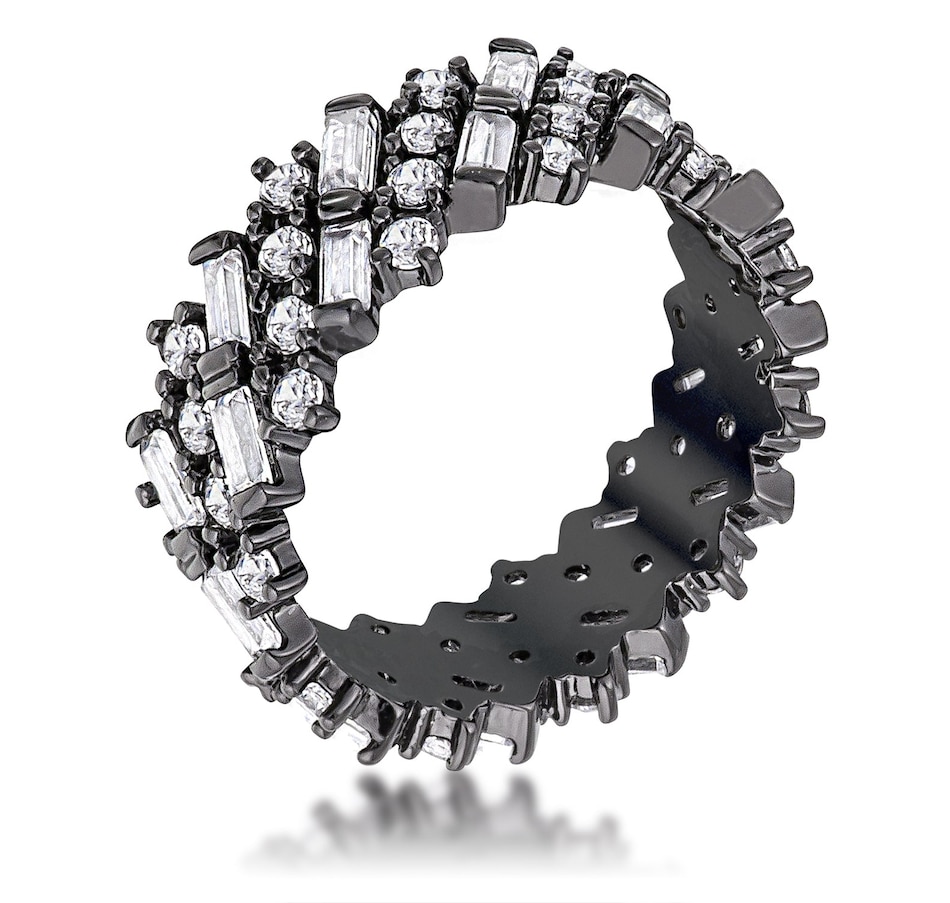 This thick eternity band offers modern versatility through alternating slanted baguette and round stones. Sitting atop a deep hued hematite finish this rich design offers dark undertones yet highed by generous lines of CZ stones to create a smoky ambiance.