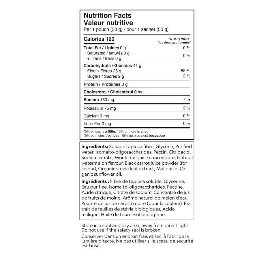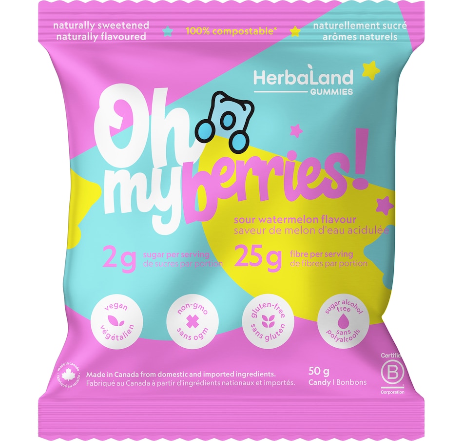 Oh my! These gummies are the best candy around, with only 2g of sugar and 25g of fiber per pouch. Made from plant-based ingredients and all-natural flavours, these gummies are the perfect healthy snack!