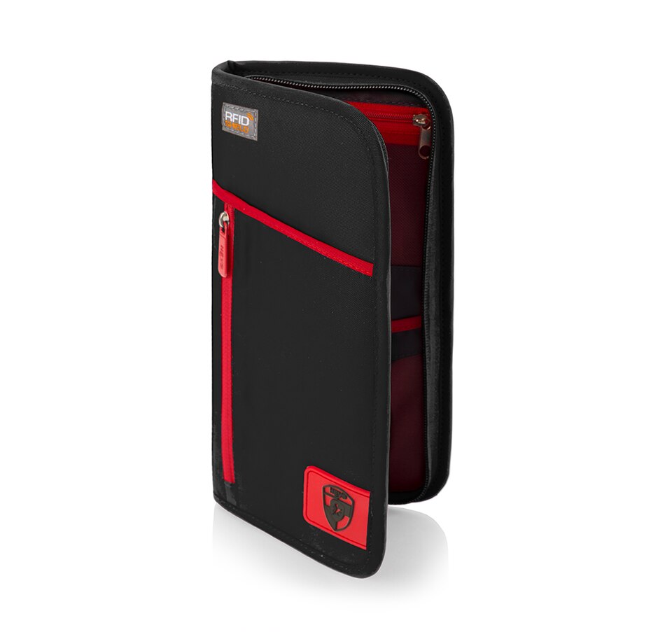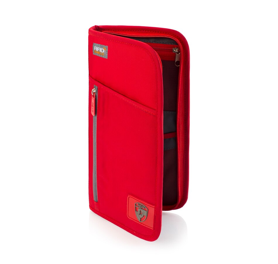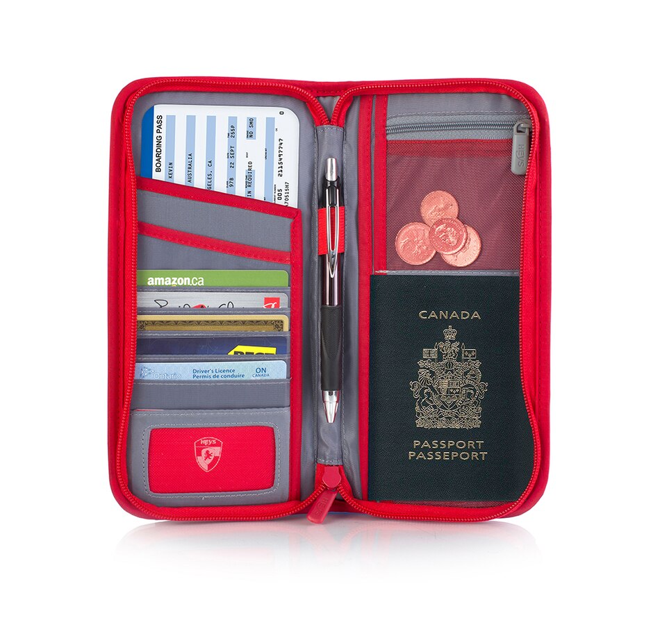 The Heys RFID-Blocking Document Wallet is ideal for fashionable, organized travel with the peace of mind that your ID cards, passport, credit and debit cards are protected by RFID (Radio Frequency Identification)-blocking technology, a special layer of fabric that keeps your identity and personal information safe from wireless theft. This technology is designed inside the wallet for 24/7 protection, blocking any thieves' RFID readers from illegally scanning your RFID chip-enabled items and accessing your personal information. It's made from durable polyester, with sturdy zippers and stylish polyurethane accents, and features fully enclosing zippers to keep your travel documents, passport, money and cards secure. It also comes with a pen holder, three exterior pockets (two in front and one in back), six interior pockets, a ticket/document flap and six card slots. It's perfect for staying organized, protected and stylish while travelling!