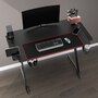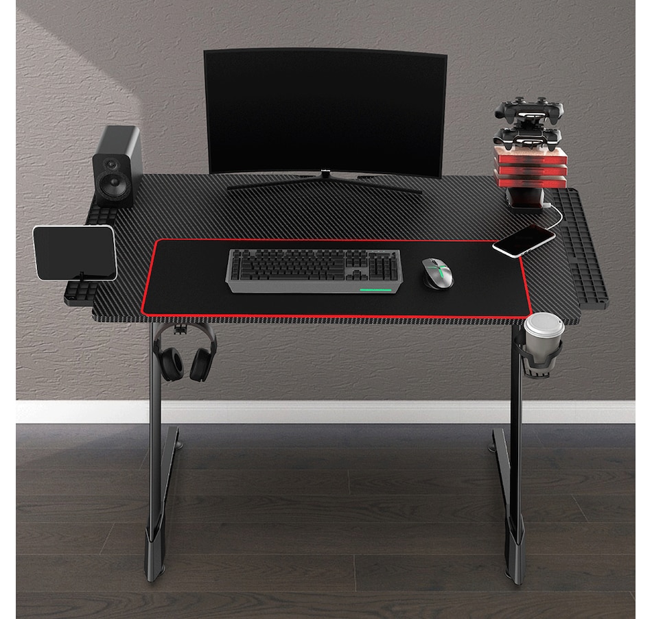 The Aggro gaming desk has a sleek, carbon fiber texture and the gaming surface has ample space for your gaming monitors, keyboards, and additional gaming gear. Comes with cable management system, headphone hook, cup holder and gamepad holder.