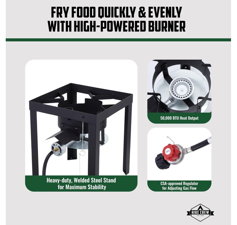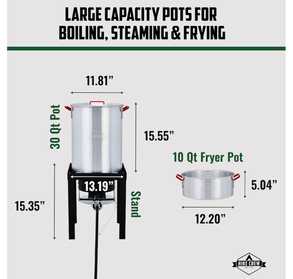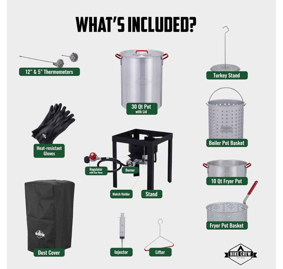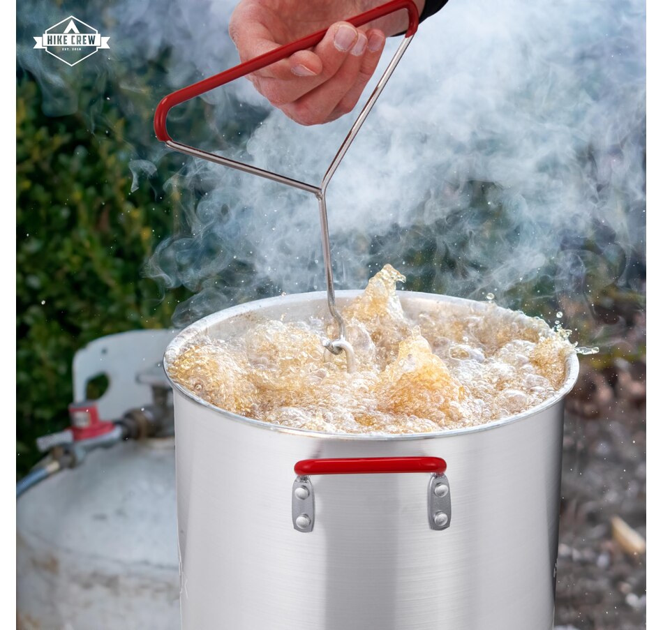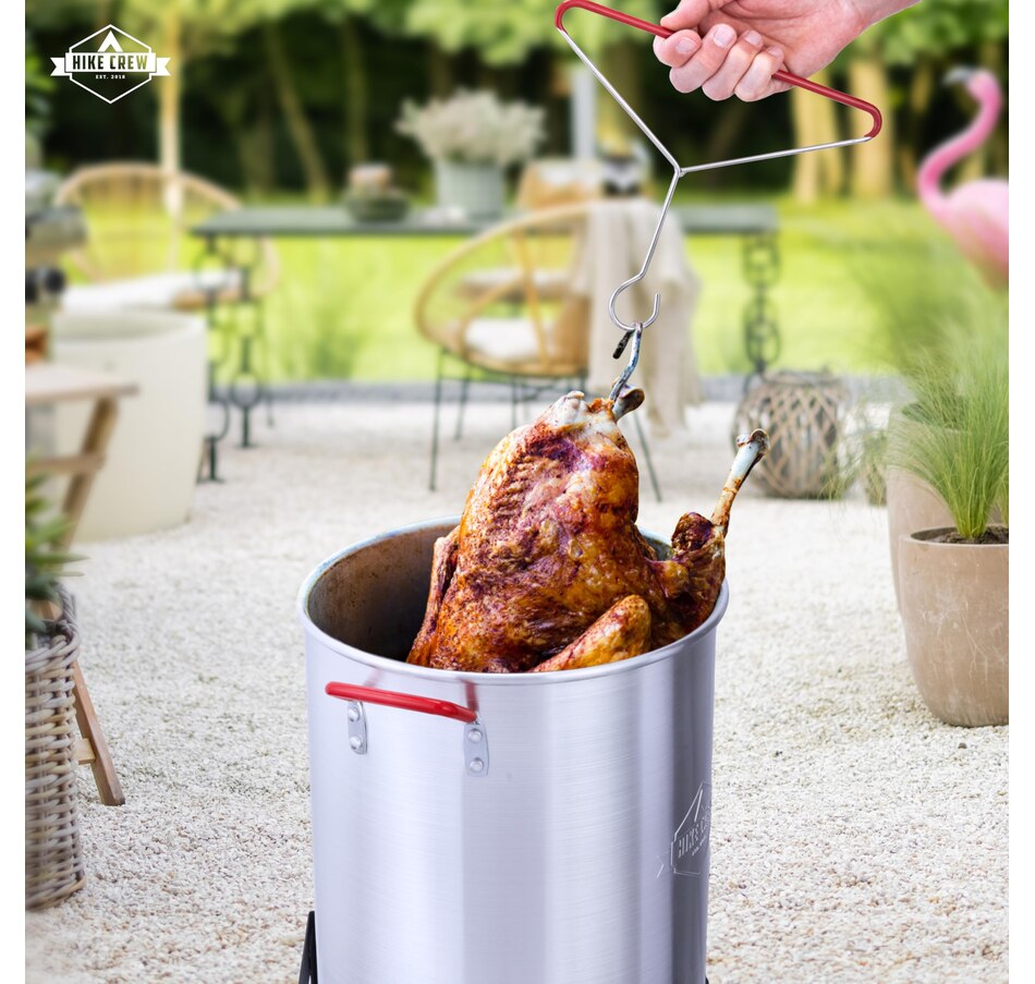 Try out the season’s hottest trend for outdoor frying, simmering, and steaming with the 30 Quart Turkey Deep Fryer Kit from Hike Crew. This large-capacity turkey cooker system features a colossal 30-quart boiler pot with basket, 10-quart deep fryer pot with basket, complete stand and burner setup, and everything else you need to churn out delicious food (alfresco only). Heating up large quantities of oil over the stove is not only dangerous for the chef, but also messy for your kitchen. Now with this outdoor deep fryer, you can deep fry poultry and other meals in the safety of Mother Nature. Just bring the bird and a propane tank for the turkey frying kit, and we’ll do the rest. In addition to our heavy-duty stand, burner assembly, and gas regulator, you’ll hone your cooking technique with a turkey stand, lifter, and injector, two thermometers, and gloves for safe handling. Despite its highly capable design, this versatile outdoor fryer also stores compactly, so you can pack it in the RV or keep it on your backyard patio. Discover how this new cooking method can bring delectably crisp texture and mouthwateringly moist taste to your favorite roasts. Add a Hike Crew Turkey Frying Pot Kit to your cart today!