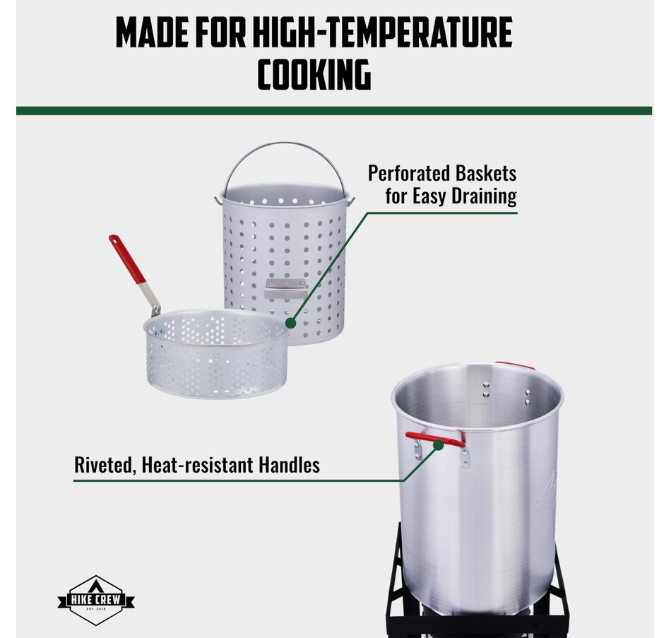 • Massive 30-quart boiling pot with built-in handles, lid, fryer stand & fryer basket