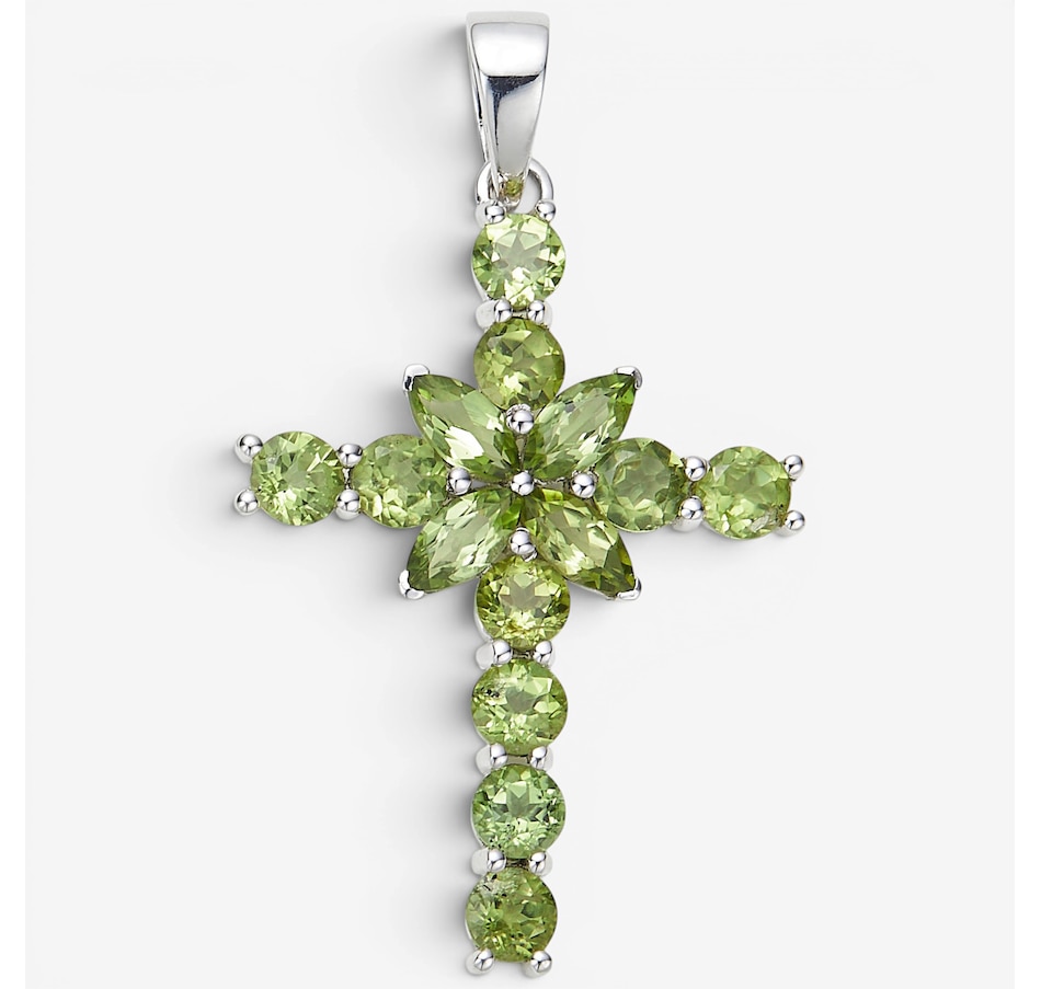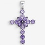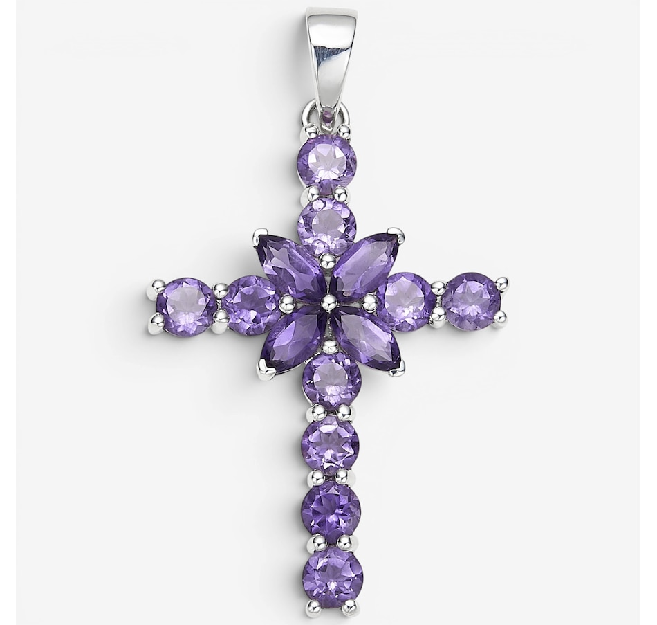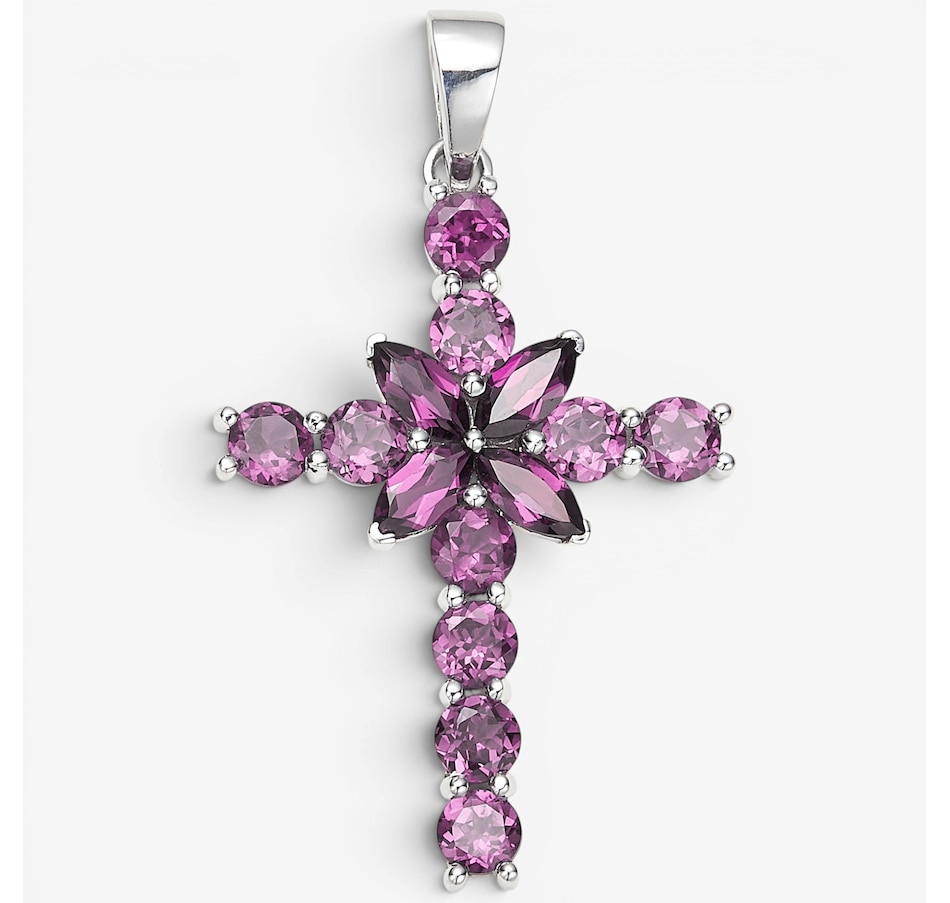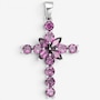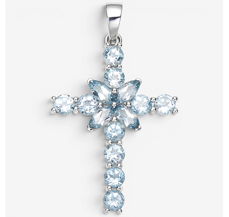 This sterling silver cross pendant features a layered gemstone design that combines marquise and round accents for balanced colour and sparkle. Prong‑set stones create definition along the cross silhouette, offering a bold yet versatile piece designed to be styled with a variety of chains.