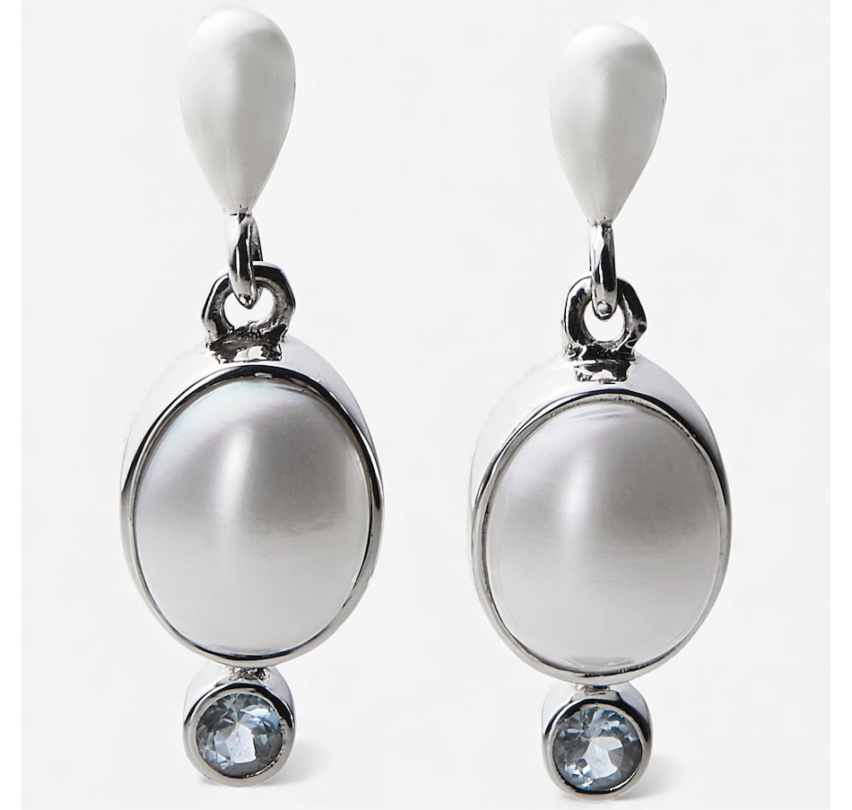 • (2) 3mm round, bezel set and faceted gemstones — iolite (0.24 av.ctw), white pearl (0.40 av.ctw), blue topaz (0.32 av.ctw)