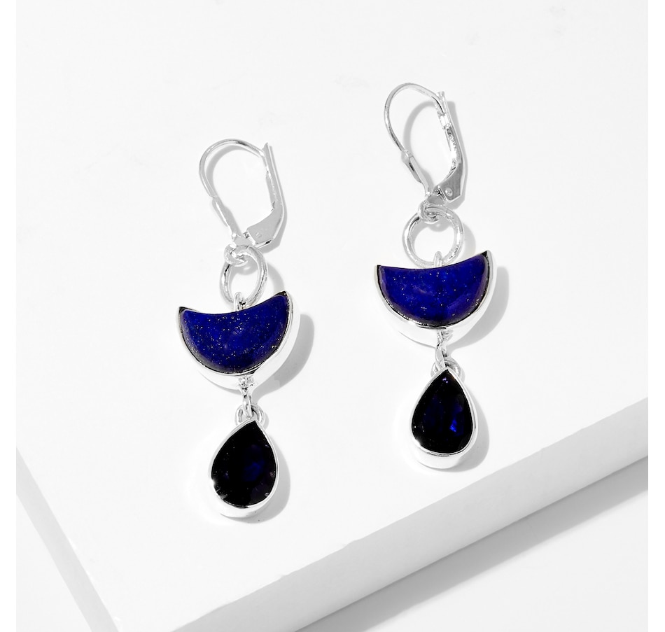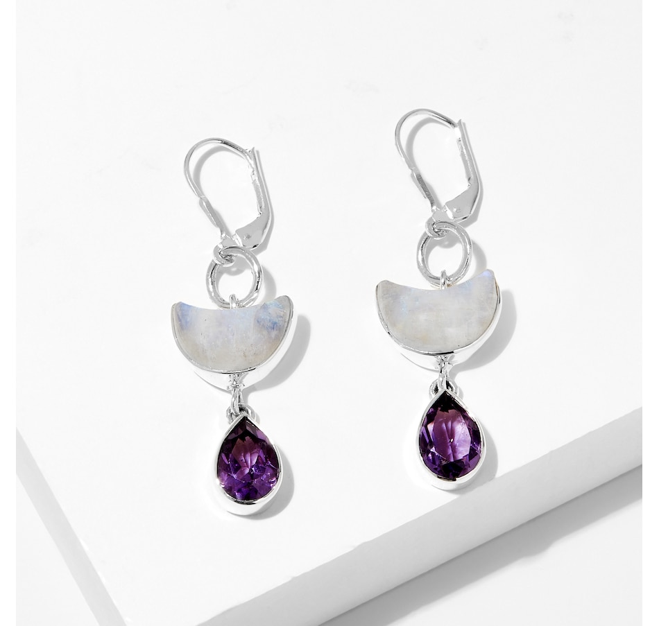• (2) 7 mm x 10 mm pear-shaped, bezel-set and rainbow moonstone/amethyst (3.60 av. ctw), or labradorite/peridot (3.60 av. ctw), or lapis/iolite (3.00 ctw)