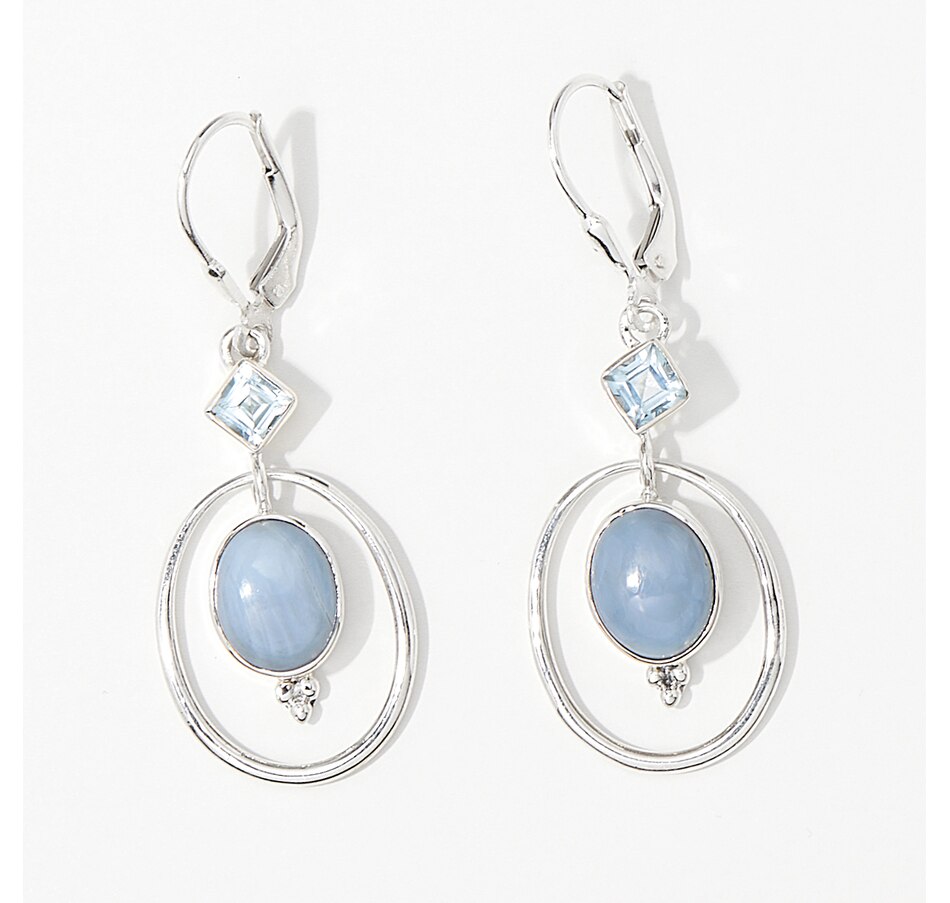 • Average combined carat weight: zoisete/garnet (7.00 av. ctw), malacite/peridot (8.66 av. ctw), or Peruvian blue opal/blue topaz (5.00 av. ctw)