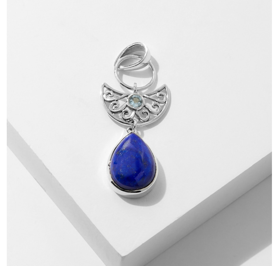 • (1) 13x18mm pear shape, bezel set choice of gemstone: 10.30 av.ctw (lapis/blue topaz), 11.60 av.ctw (rainbow moonstone/garnet), 10.80 av.ctw (labradorite/peridot)