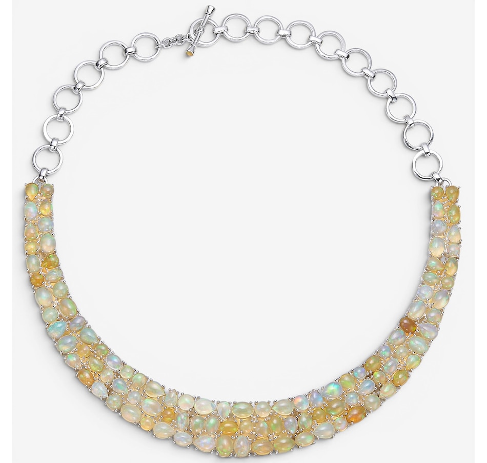 This sterling silver link necklace features a striking sequence of freeform opal cabochons that create a bold, continuous display of colour and texture. The articulated design allows the necklace to sit comfortably along the neckline, while the toggle closure adds a distinctive finishing touch.