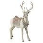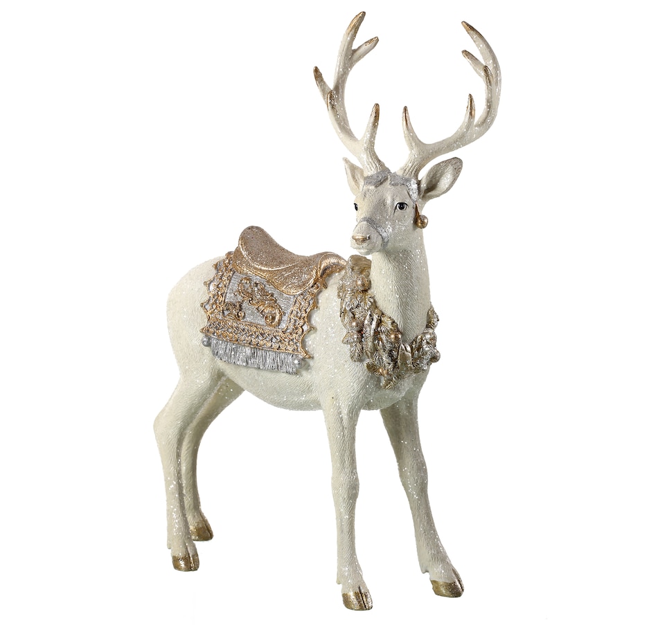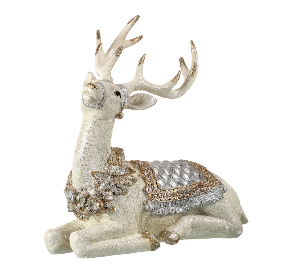This glittery and regal resting deer, in multiple metallic glitter finishes, complements any holiday decor style. The reindeer's association with Christmas is related to both Santa's magical sleigh and its enduring presence in harsh, northern climates.