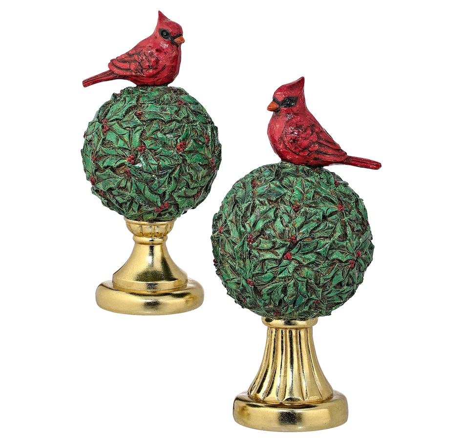 This set of two red cardinal figures perched atop a faux holly topiary ball with a gold pedestal base is an instant upgrade for any holiday themed display. It can also make one or two wonderful and elegant gifts for anyone special on your shopping list.