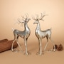 Set of 2 silver deer with graceful profiles and silver finish. Stand-alone decorations you can display together or separately in different locations add a quiet holiday elegance in modern or traditional theme settings. Slender shape and size lets you display each figure in places often too small for ordinary table top decor.