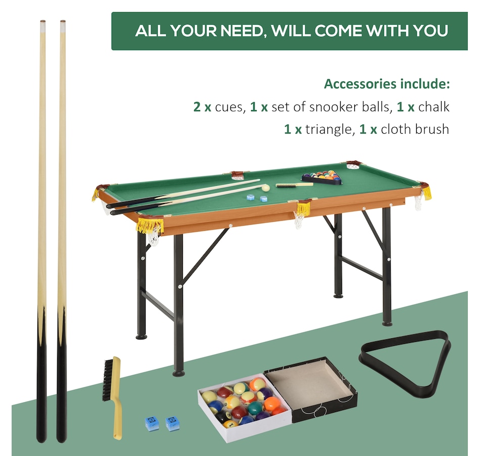 ● Looks and feels like an authentic pool table, only smaller ● Polyester fleece top for smooth rolling ● Bumper cushions allow ricochets that resemble a real table ● Perfect your pool shot and accuracy on a smaller table ● The legs fold up so you can easily store it when not in use ● Includes: two cue sticks, full set of balls, chalk, brush and a triangle rack