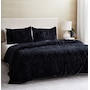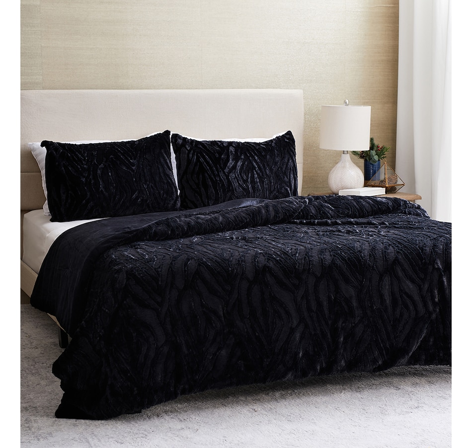 This luxurious three-piece faux-fur comforter set with a carved zebra pattern in a dramatic black colourway is sure to enhance your bedroom décor!