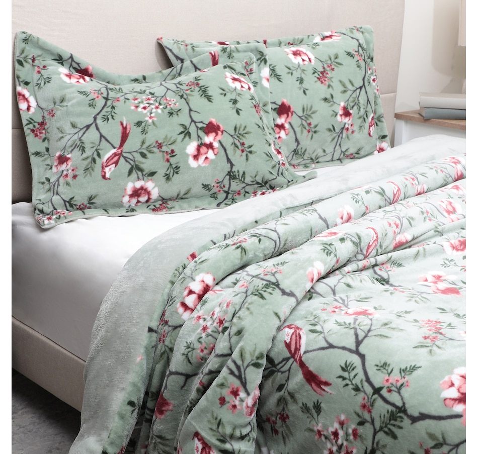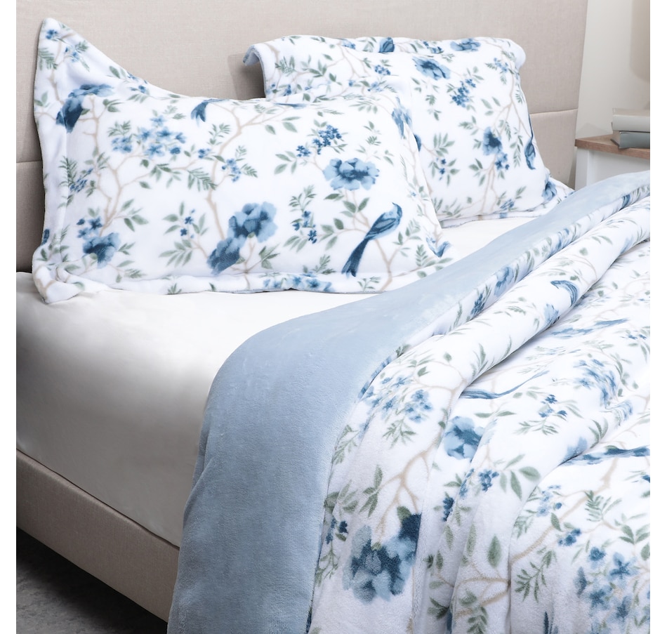 This Mayfair three-piece comforter set features a beautiful spring theme with floral branches and songbirds, all made with soft microfibre fabric that's easy care to care for.