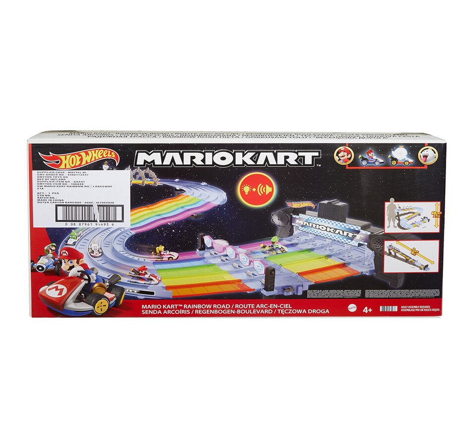 Experience the iconic Mario Kart Rainbow Road course in the real world with the Hot Wheels Mario Kart Rainbow Road Raceway track set! The rainbow-coloured course reaches eight feet long and two feet high for maximum thrills, and has lights and sounds for a big impression. Two different layouts (straight or curved) create different races, controlled with an electronic start and a finish gate that displays the winner. The track set also features a spinning Block Item Box randomizer with pop-up features, 3D sculpted figures and decorations that add to the excitement. Get racing right out of the box with two included Mario Kart 1:64 scale die-cast karts, an exclusive King Boo and, of course, Mario. There are even parking spaces located in the support pillars of the playset for easy storage!