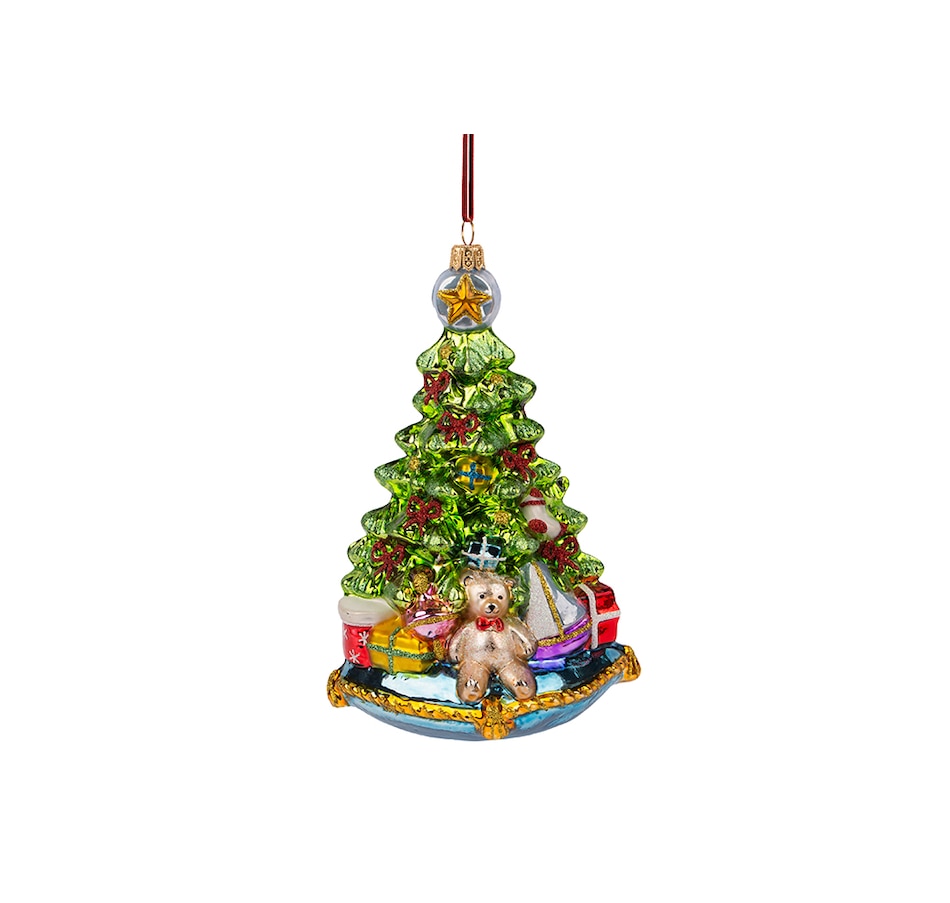 This gorgeous ornament is a stunning combination of colours: sky-blue, gold, light-green and red. It consists of an elegantly shaped pine tree topped with a gold star, filled with red glitter bows and gold details, and surrounded by gifts and toys: a teddy bear and sailboat are among them. Everything rests on a lovely blue pillow detailed with gold brocade and tassels. Each one of these pieces takes five days to make. It comes with collector's tag for authenticity, and is carefully packaged in a lovely collector's box for easy gifting.