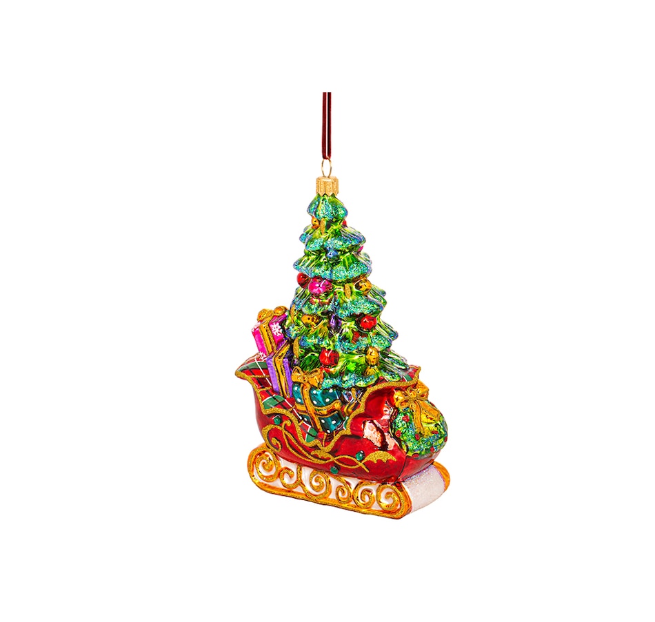 This delightful sleigh will make a lovely addition to your collection or a wonderful holiday gift. It stands alone on a shelf, table or mantle and makes a lovely holiday show-piece. Originally sculpted in clay, this ornament was then then cast into a metal mold used by glassblowers to create a delicate glass shape. It is then crafted with hand-applied colours and glitter details by skilled artists.