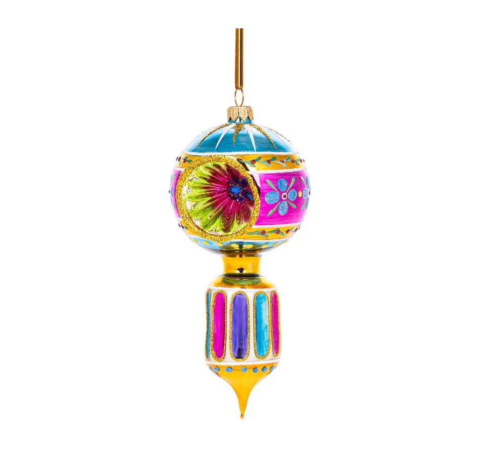 This unusual retro shape of this ornament is a beautiful example of traditional glassblowing and decoration techniques, making it perfect for adding a sophisticated and festive touch to any Christmas display.