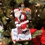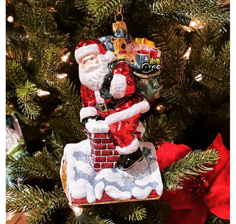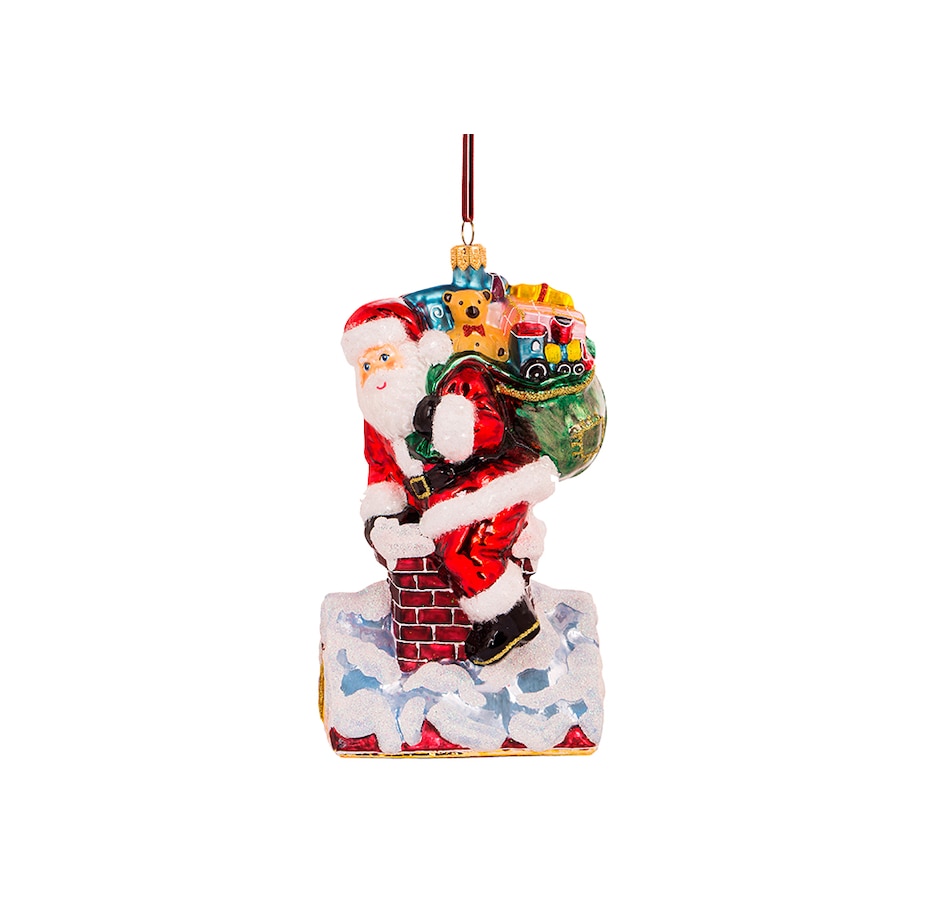 This attractive, whimsical ornament can stand by itself. It makes a lovely holiday show-piece on a shelf or mantel, as well as your tree. Santa is wearing his classic white-fur trimmed coat and pants (which is achieved with a special "furry" glitter) and a black belt as he attempts to slip down a chimney carrying a sack filled with gifts, including a teddy bear,