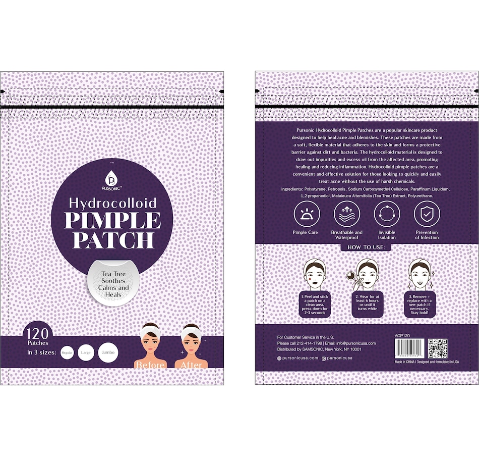 Introducing the Pursonic Hydrocolloid Pimple Patches - your ultimate solution for conquering acne the gentle way. Crafted from a soft, flexible material, these patches become your skin's shield, locking out dirt and bacteria while gently aiding the healing process. With a 120-pack in three different sizes, these patches offer convenience and efficacy in treating acne without resorting to harsh chemicals. Simply apply, let the patch work its magic, and witness clearer, smoother skin in no time. Soft, flexible material forms a protective barrier against dirt and bacteria, aiding in a quicker healing processConvenient and easy-to-apply solution for treating acne without harsh chemicalsGentle on the skin while effectively absorbing impurities and promoting skin recoveryPromotes clearer, smoother skin with hassle-free application for on-the-go acne management