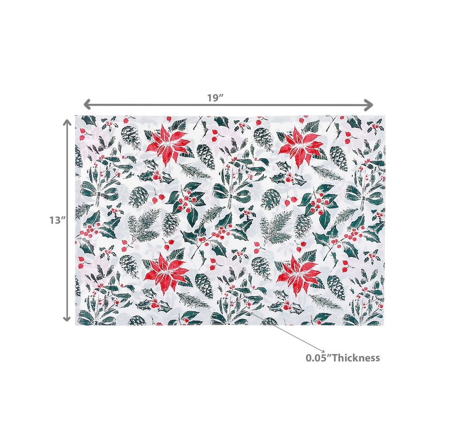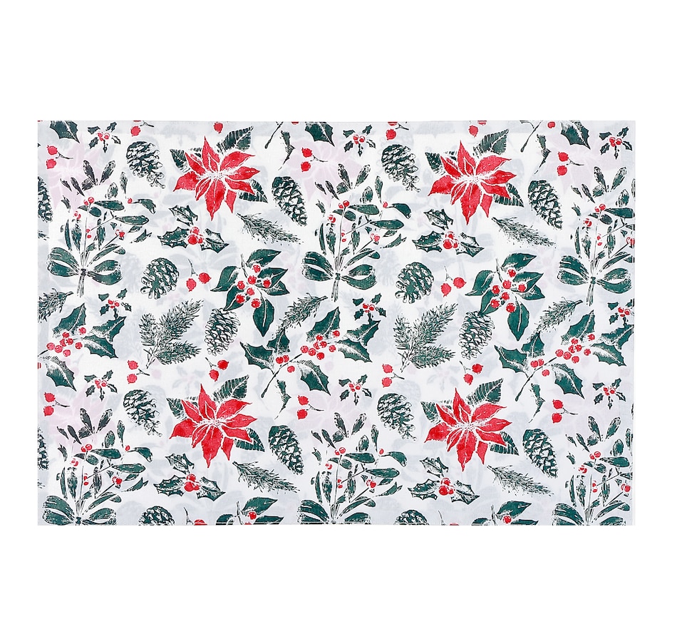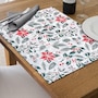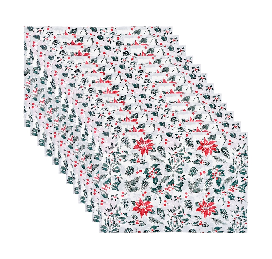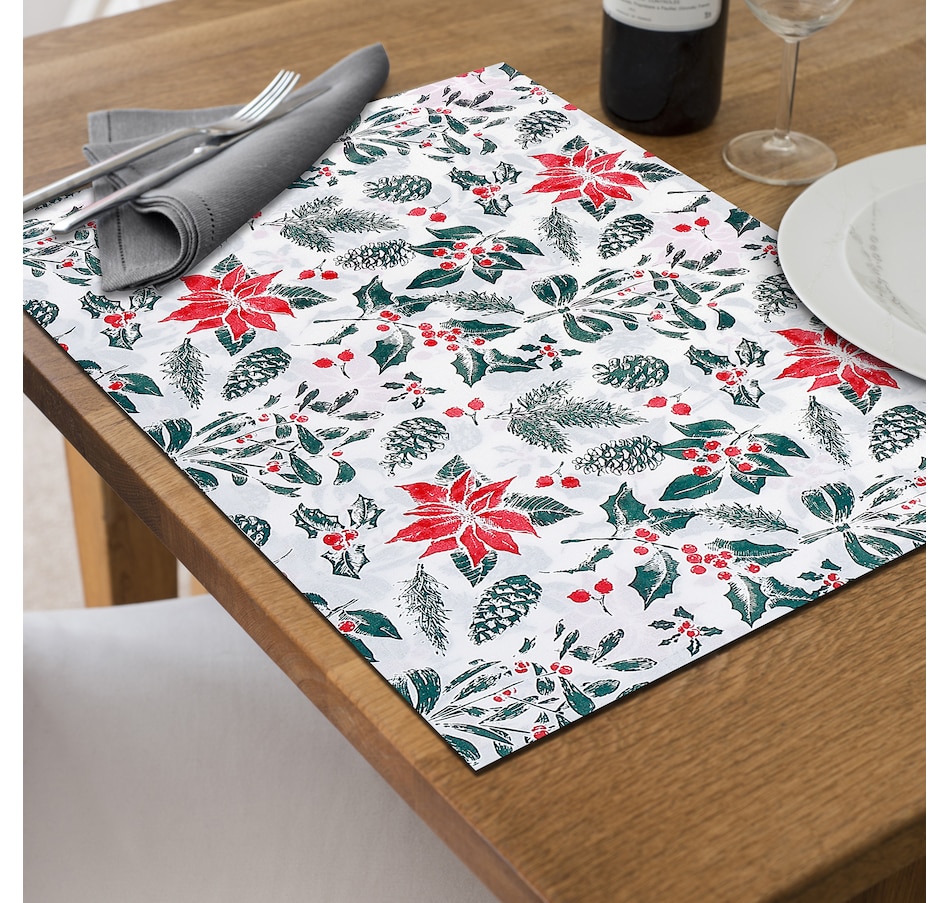 • Christmas placemats showcase a classic Christmas-inspired pattern with mistletoe, poinsettias and holly berries, bringing warmth and holiday cheer to any table