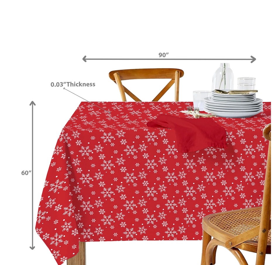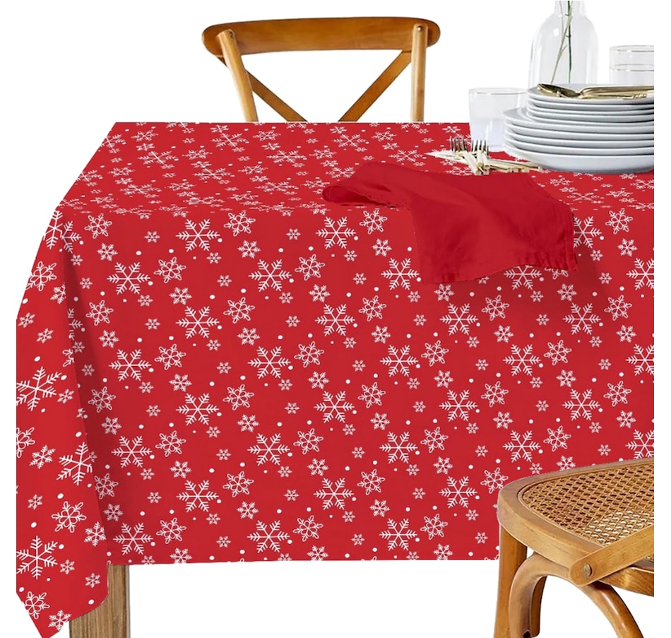 Create a winter wonderland on your dining table with this tablecloth featuring a beautiful snowflake print. Designed to bring holiday cheer to your gatherings, this elegant tablecloth showcases a timeless winter motif that adds a touch of frosty charm to any setting while complementing a variety of tableware styles. Crafted from soft, durable cotton, it offers a smooth drape and a comfortable dining experience while protecting your table from spills and scratches. Its versatile size makes it ideal for both casual family meals and holiday feasts, adding seasonal charm to any setting.