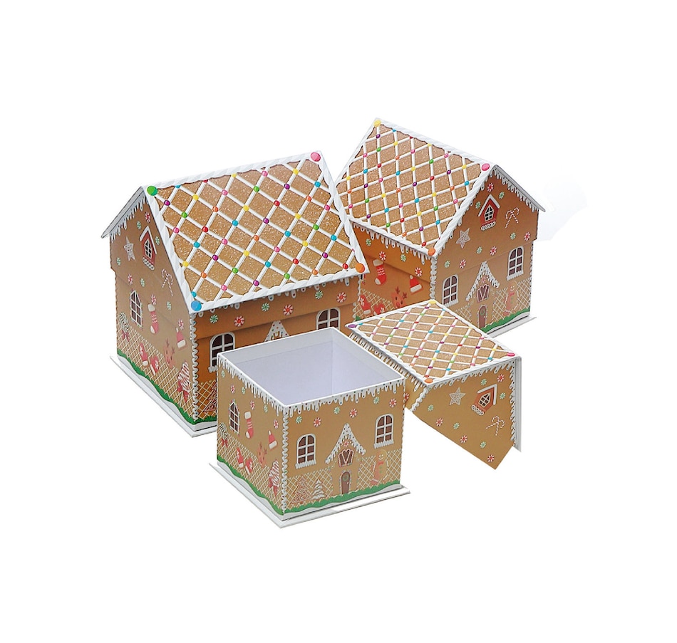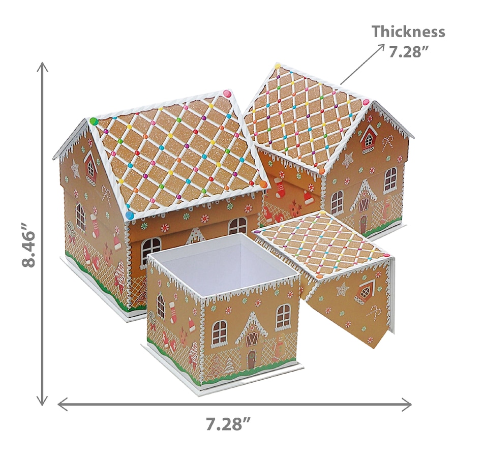 Add a festive and functional touch to your holiday décor with these house shape nesting oxes. Designed to resemble charming Christmas houses, this set is perfect for gift packaging, holiday storage, or seasonal decoration. Each box features vibrant, multi-coloured designs with whimsical holiday details, making them an eye-catching addition to any space. The nesting feature allows for easy storage when not in use, and the durable construction allows for longevity throughout the festive season. Whether displayed as a decorative accent or used for wrapping special presents, these boxes bring warmth and cheer to any holiday setting.