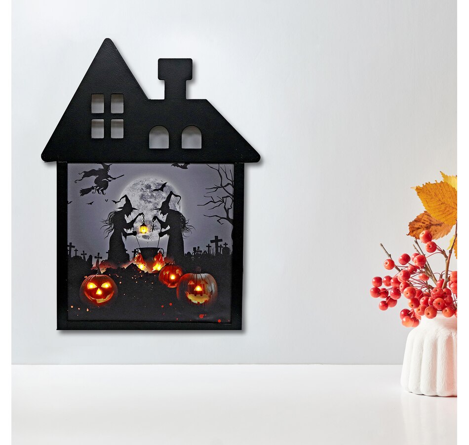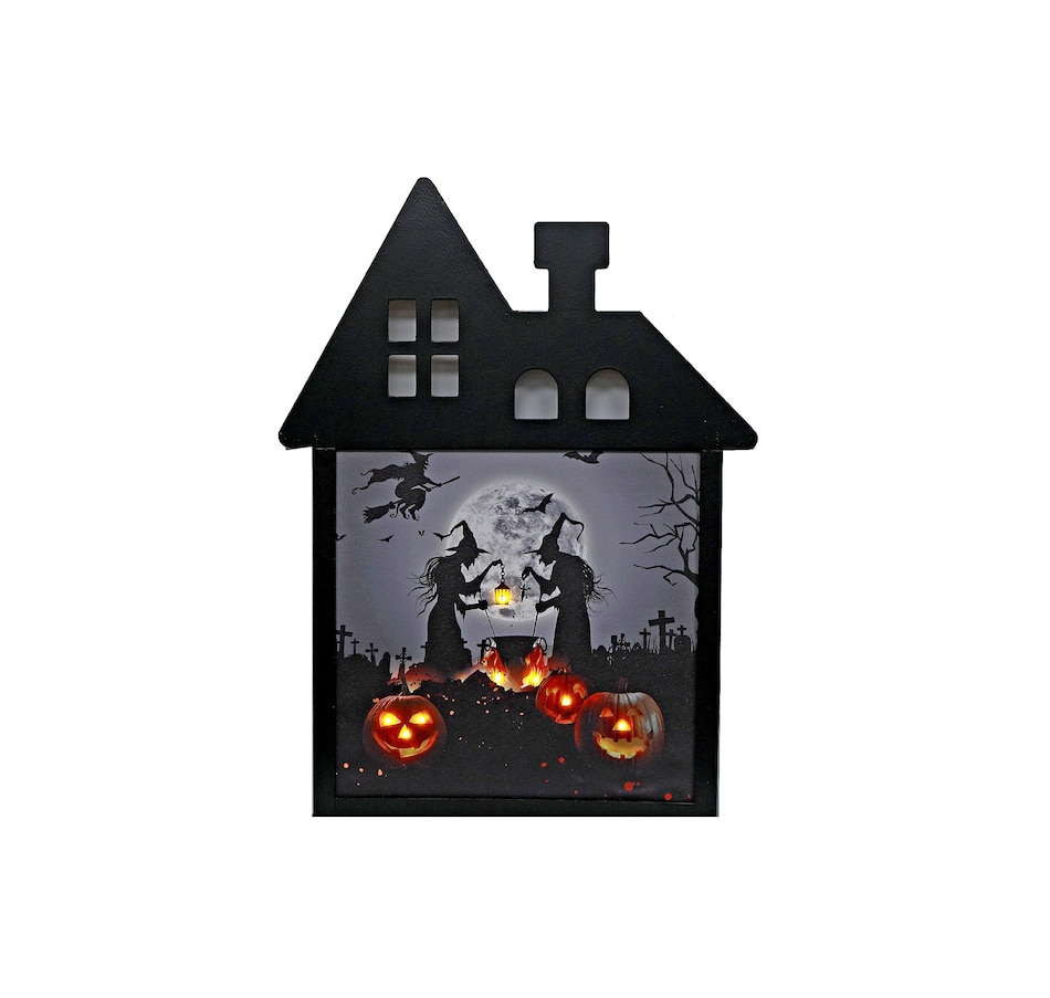 • Haunted house-shaped canvas wall art with LED-lit jack-o-lanterns and a chilling witch-themed backdrop for the ultimate spooky vibe