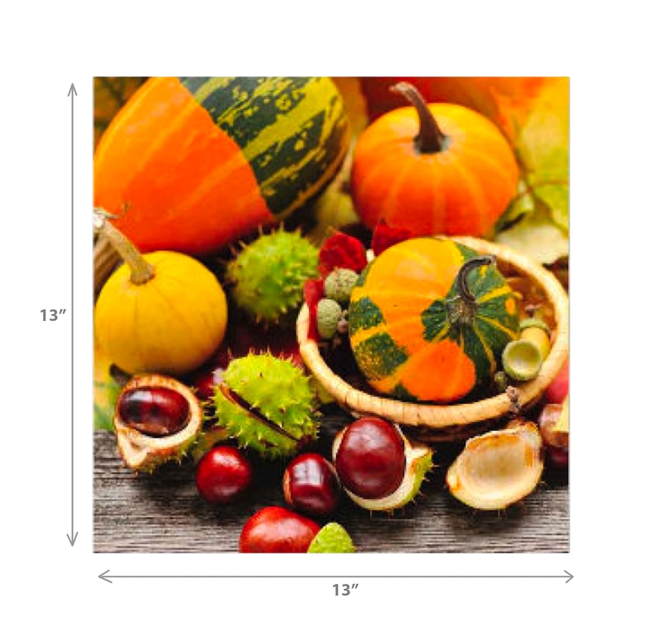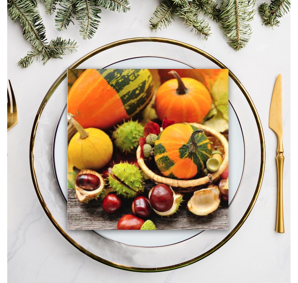 • These soft and absorbent 3-ply napkins feature a vibrant pumpkin and chestnut design, adding a festive autumn touch to your table setting.