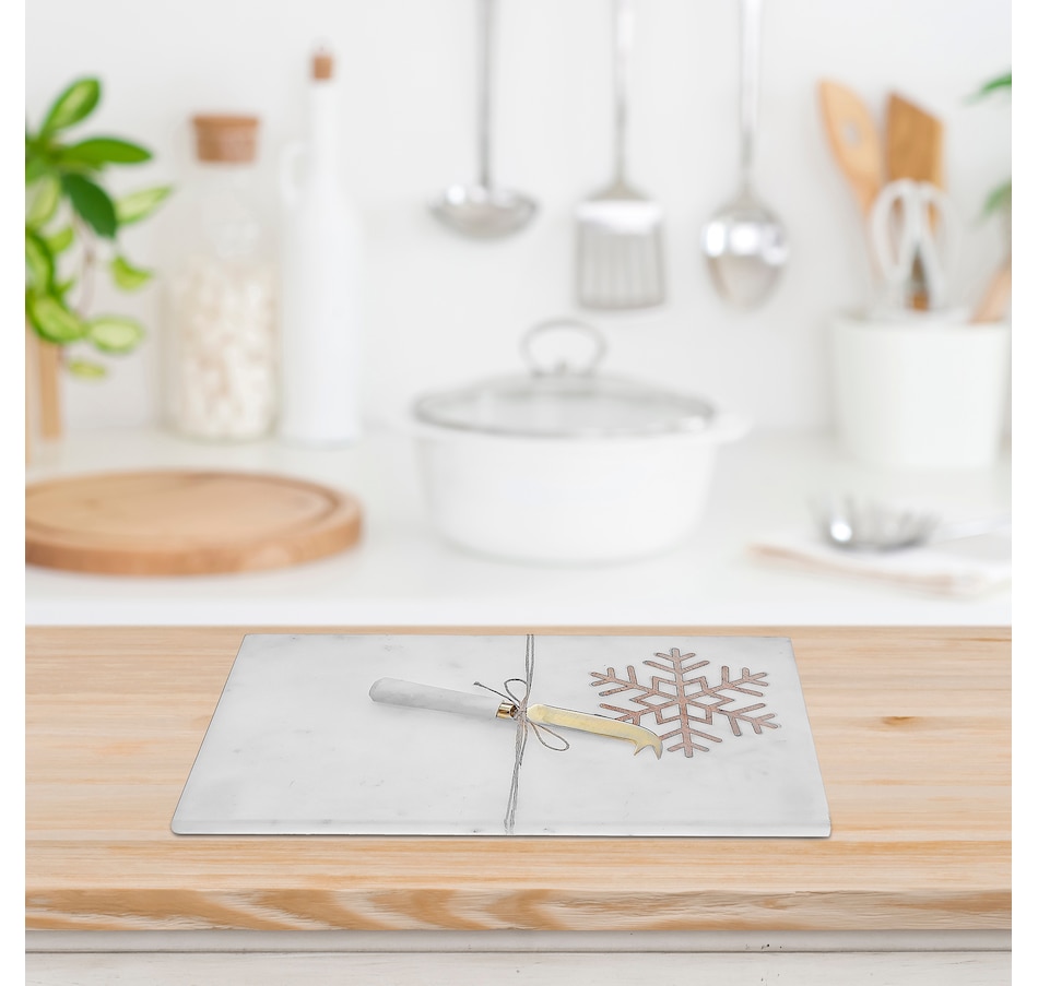This stunning rectangular marble cheese board with wooden snowflake inlay from IH Casa Décor is the perfect addition to any kitchen or dining table, adding a touch of elegance and sophistication. The crisp white of the marble combined with the natural wood snowflake inlay creates a unique and eye-catching design that will impress all your guests. Use it for serving cheese or appetizers, or even as a decorative centrepiece.
