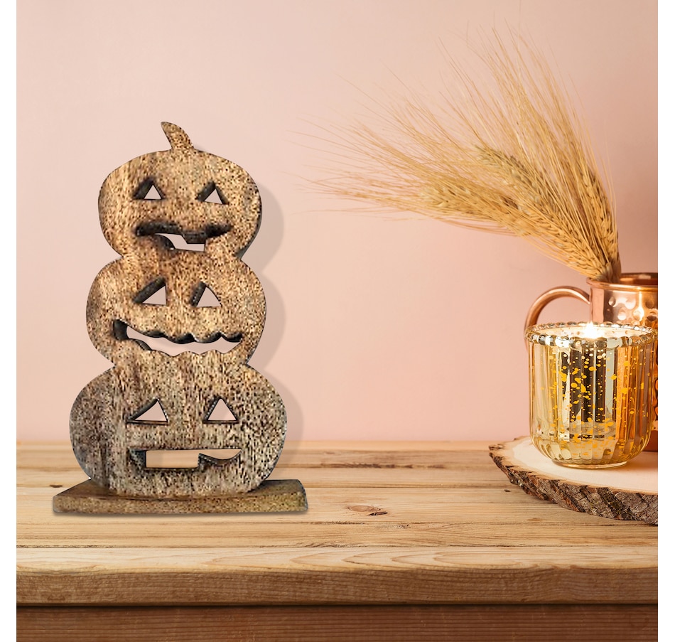 This stunning wood carved triple jack-o-lantern piece from IH Casa makes the perfect addition to your Halloween décor! This beautifully handcrafted decoration features three intricately carved pumpkins on a rustic wooden base. Made with high-quality wood, this display can add an eerie charm to any room in your home, and it's also great for outdoor use and will withstand any type of weather conditions. Perfect for parties or just for adding some festive spirit to your home, this piece is a must-have décoration for the spooky season!
