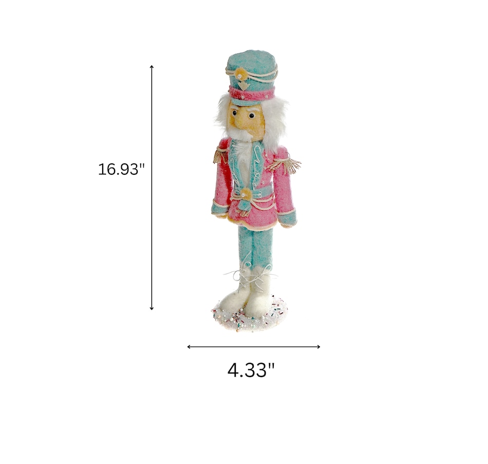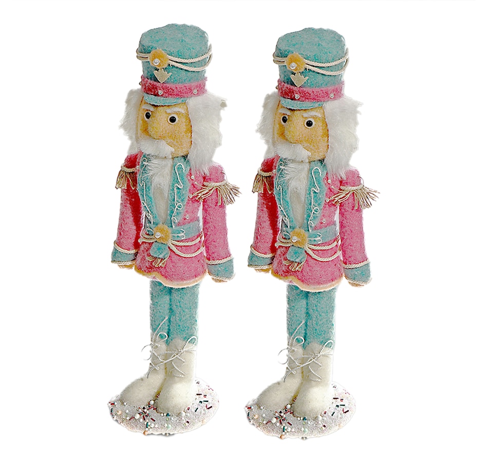 Enter a sugary dreamland with this pair of whimsical wool candy nutcracker figures! Decked out in soft pastel hues and adorned with fluffy white touches, this pair is straight out of your sweetest fantasies. Complete with delicate gold embellishments and cozy wool textures, these are the most delectable addition to your holiday decor. Whether lounging on your mantle or adding some whimsical charm to a dessert-themed display, these dashing figures will sprinkle a dollop of magic into your space.