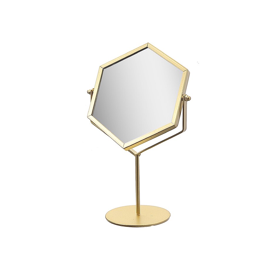 Glamourize the decor of your bathroom with this beautifully crafted golden-colored mirror on a pedestal stand. It features a hexagon-shaped mirror with a stylish and durable frame. It is perfect for placing on a dressing table or bathroom shelf, and offers an easy way to personalize and transform your living room, bedroom, bathroom, or kitchen.