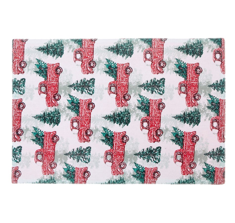 Decorate your dining table with these colorful cotton table placemats and style up your holiday setting. Featuring a multi-coloured truck and tree design on white background, they will perfectly complement the rest of your table decor. Made of quality cotton, these washable placemats are easy to clean and retain their colour and quality over time. They are sold as a set of twelve.