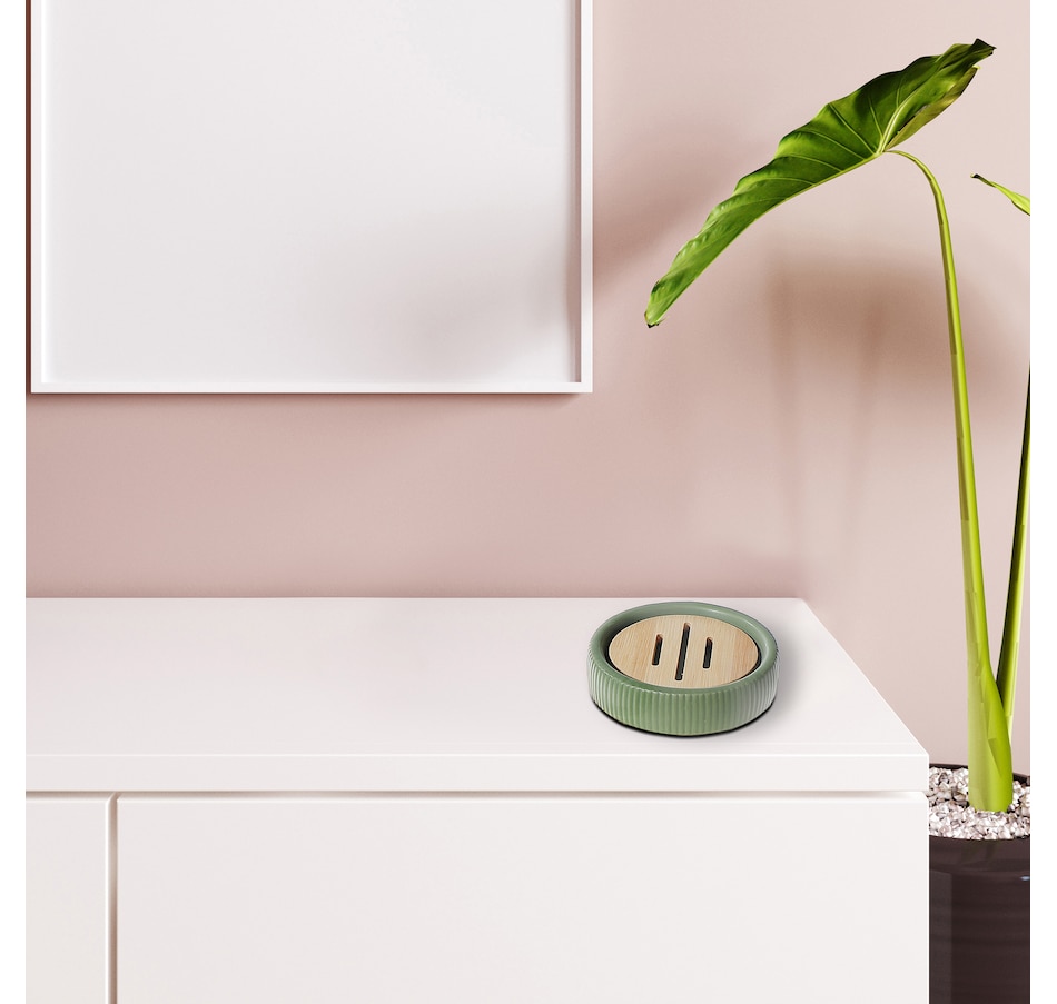 Combine style and practicality using this soap dish with bamboo on your bathroom countertop. It features a bamboo wood base with a rounded dolomite cover that keeps your soap protected. Offering a standard look, the soft green hue of the bar soap dish brings a pop of colour and luxurious charm to the bathroom space.