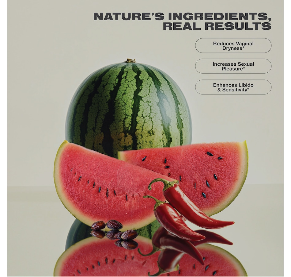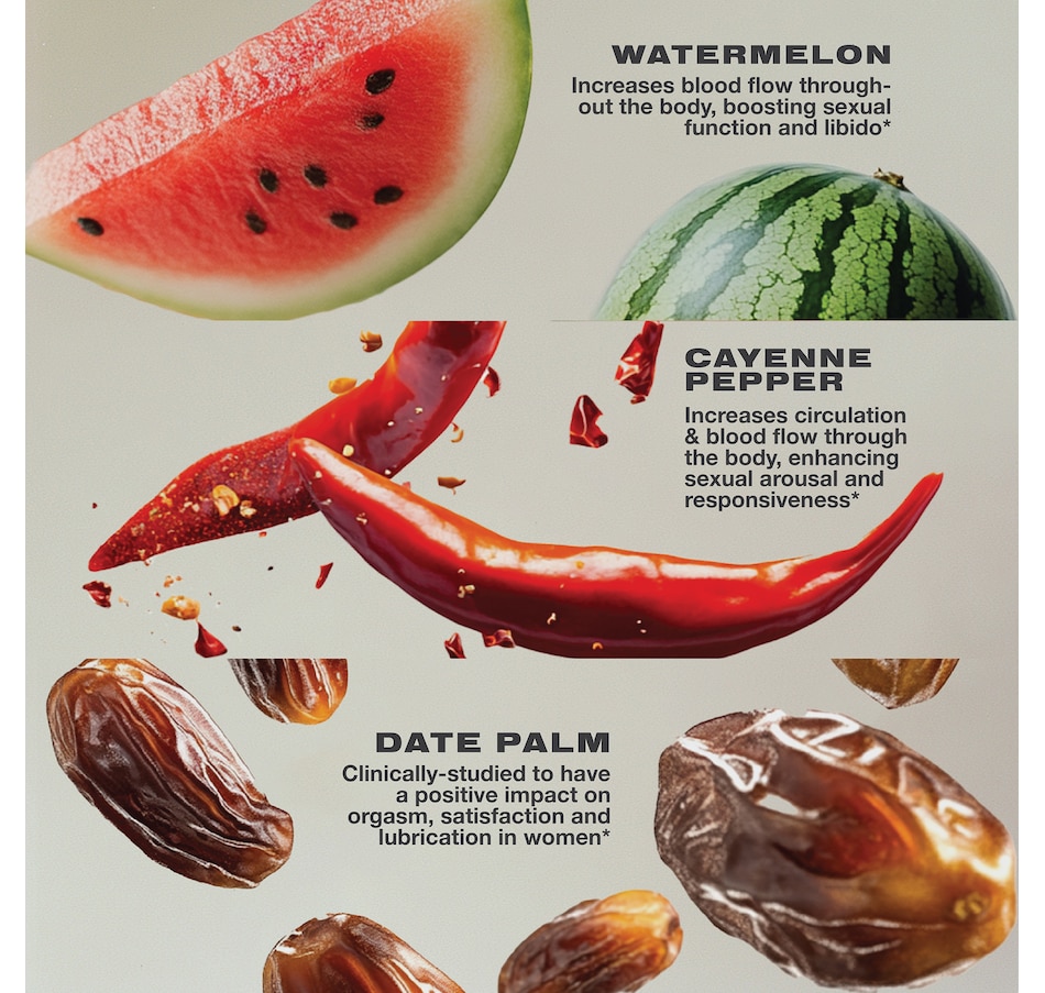 Elevate your intimacy with Sutra, formulated to address all aspects of sexual wellness, ensuring you feel empowered and satisfied every time. With Watermelon targeting enhanced blood flow, date palm supporting relaxation, and cayenne increasing sensitivity and libido, Sutra offers women the key to unlock a more satisfying and holistic approach to sexual wellness.